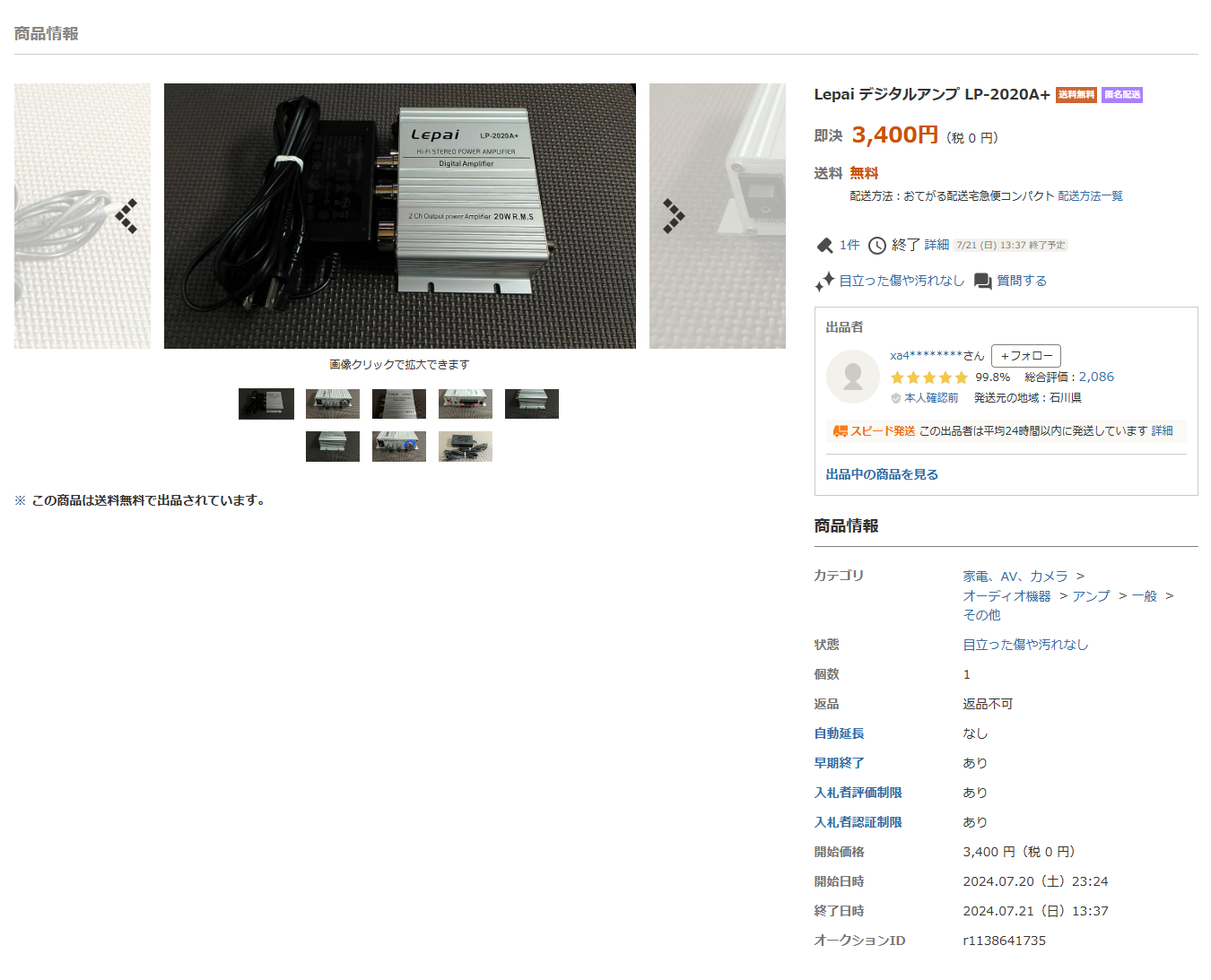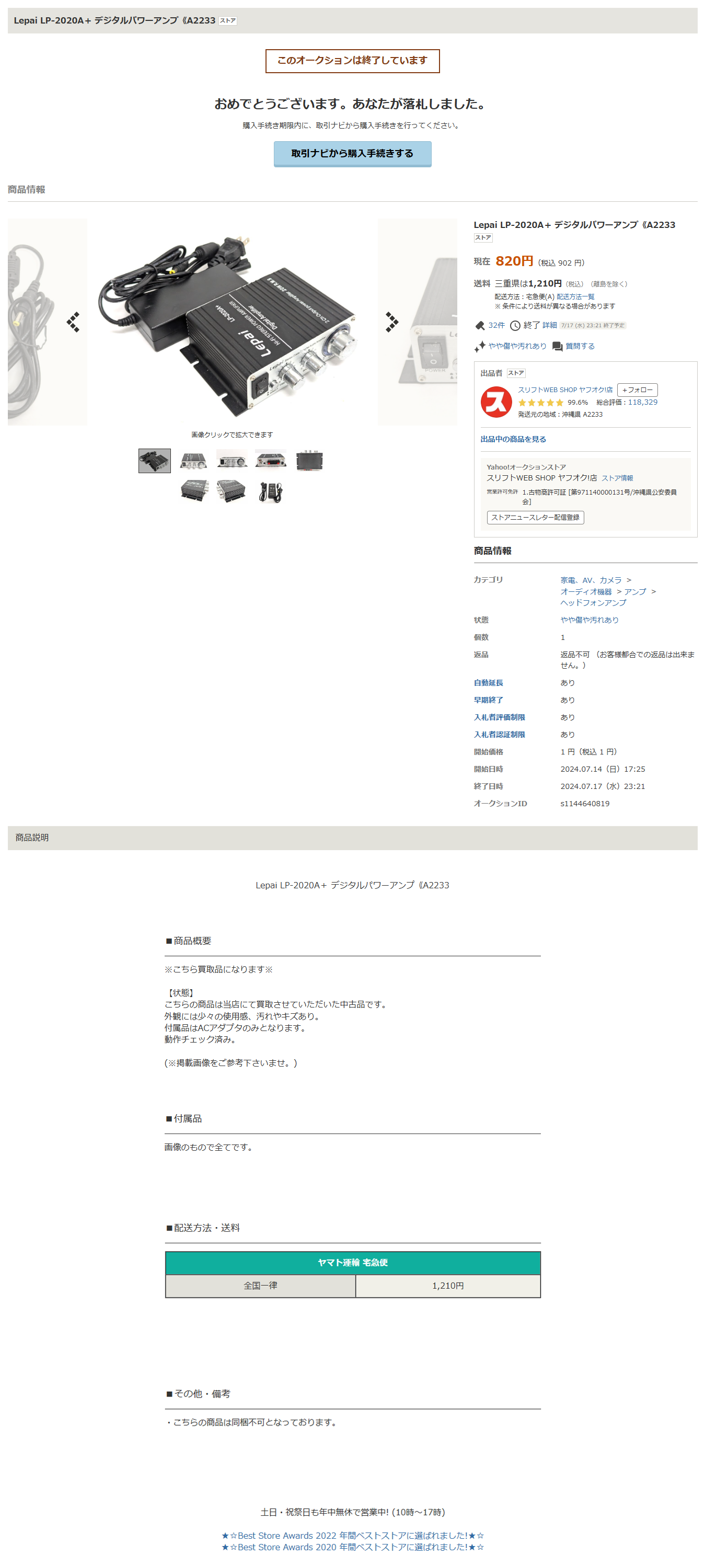 では何故このオークションに参加したかと云うと、久々に入札競争に参加して運試しがしたかったのと、どうしても元祖中華製デジタルパワーアンプの勇Lepai LP 2020A+を手に入れたいという衝動に駆られてしまいました。笑