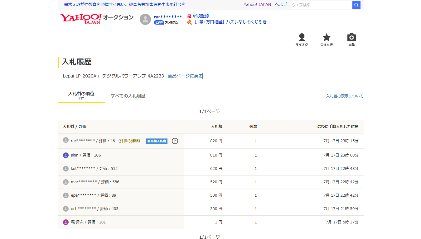 私以外の6人の入札者のみなさんは、すべてヤフオクのベテランの方々ばかりのようです。