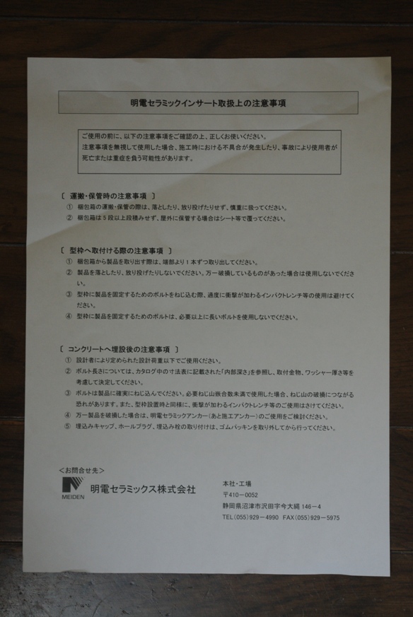 そして、インサートアンカーはリフトが脱着式の支柱であるため、錆る心配がないこのセラミックインサートを使用することに決めました。