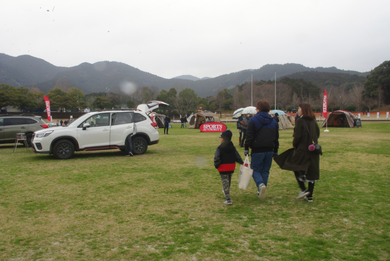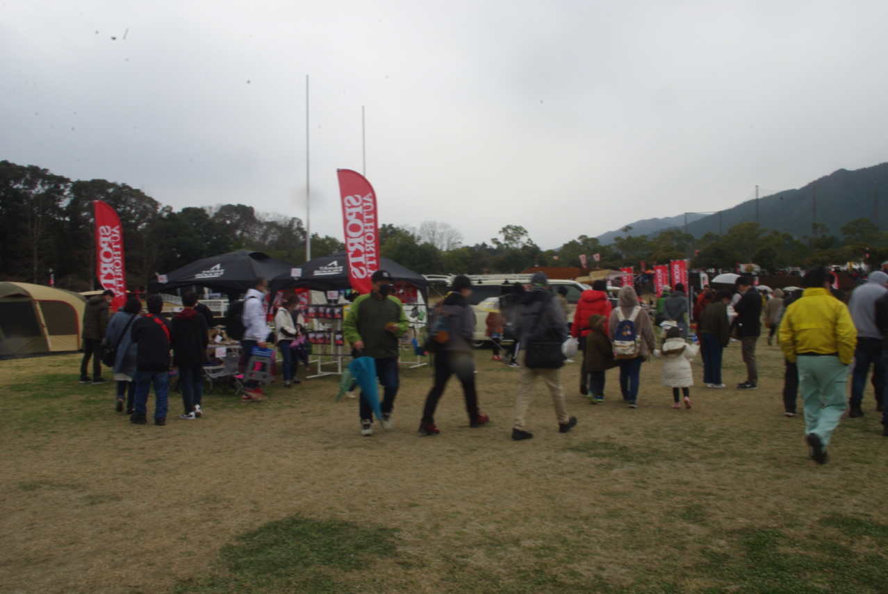 この競技場のフィールドはどうやら各種アウトドア用品の展示場になっているようです。