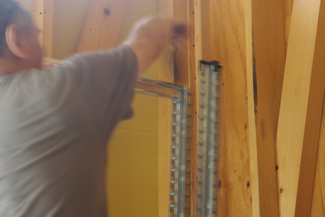 高さは任意に設定出来ますが、取りあえずメジャーで測って350㎜の間隔(これには明確な理由があります)が出来るように取り付けています。