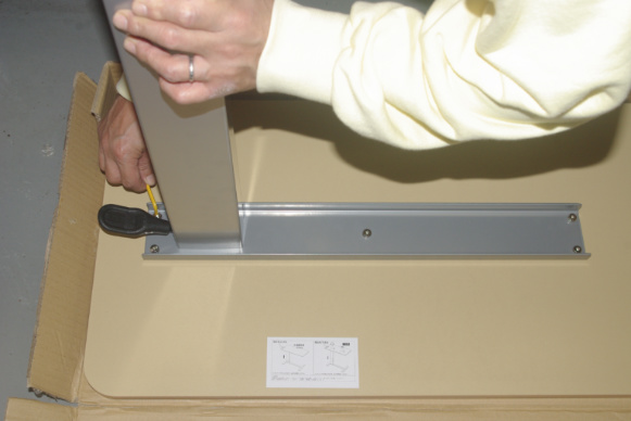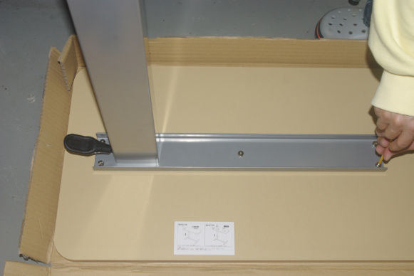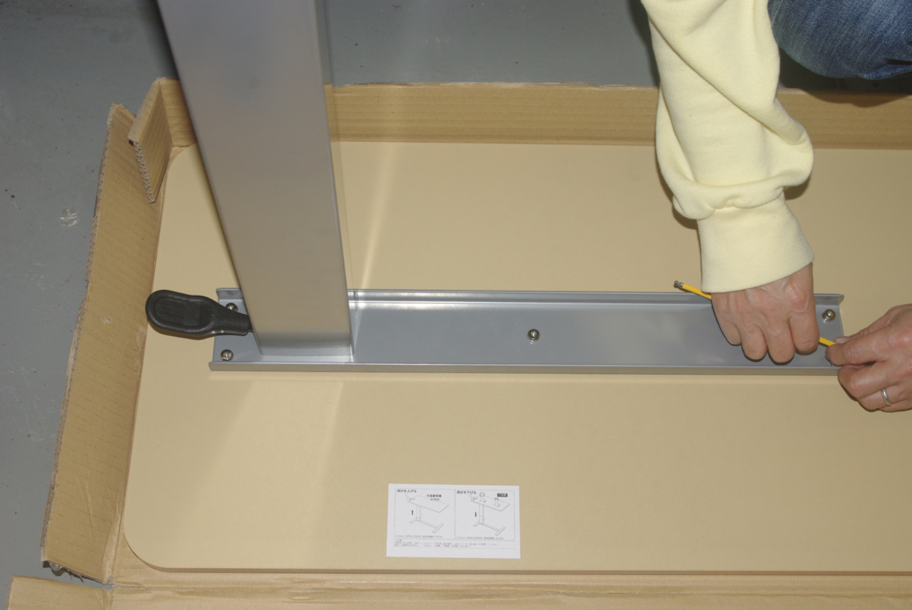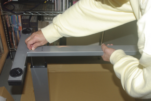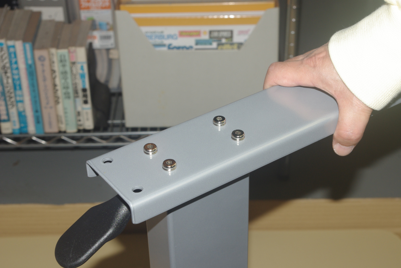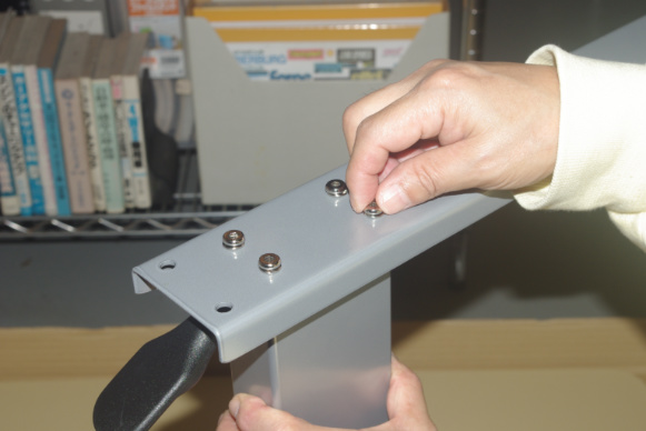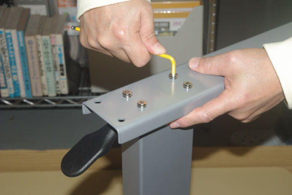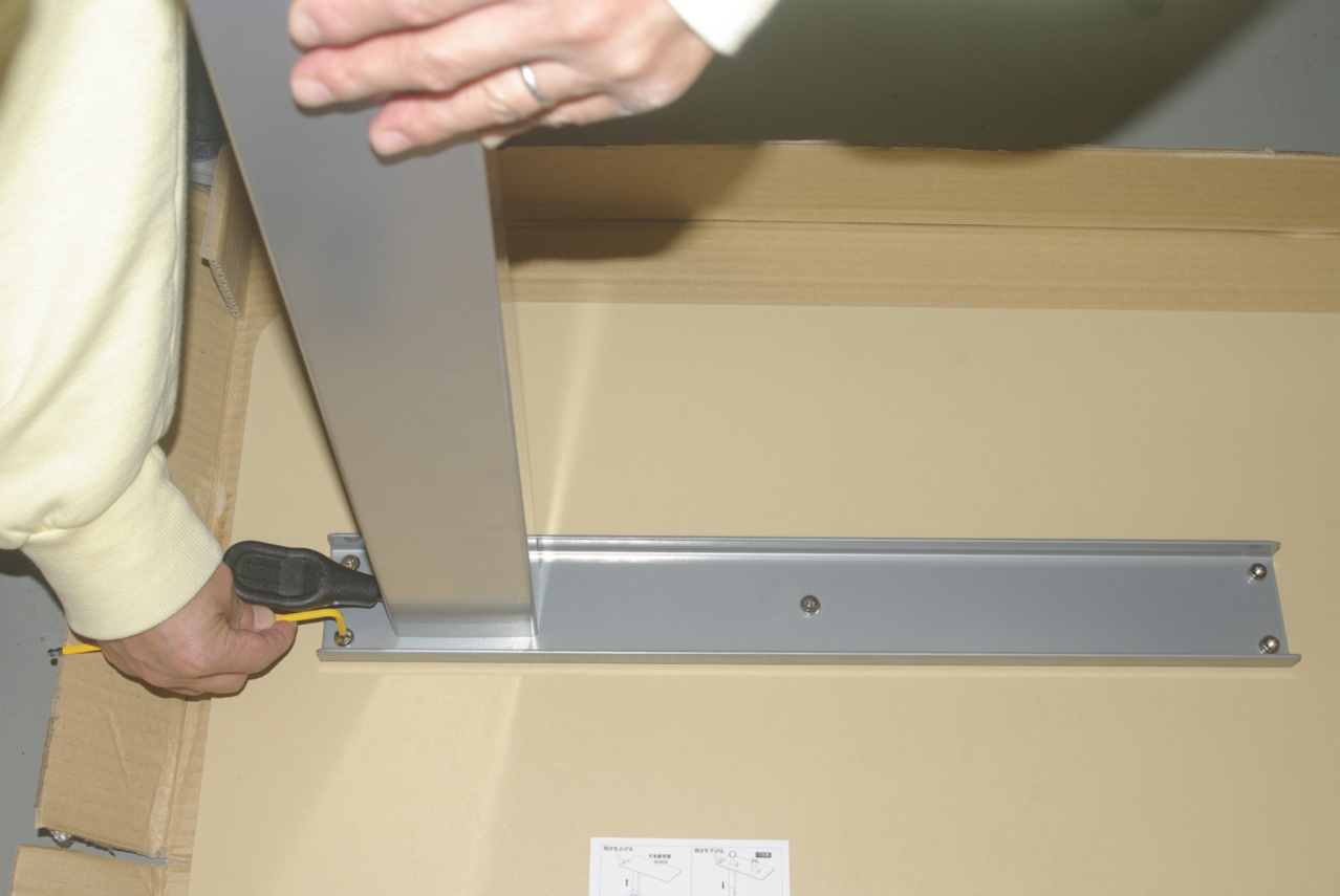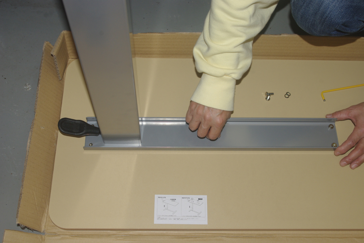 次に裏返しになっている天板に、天板支柱ブラケットを取り付けます。