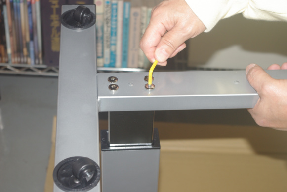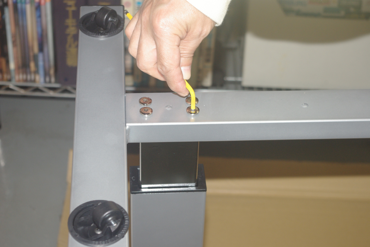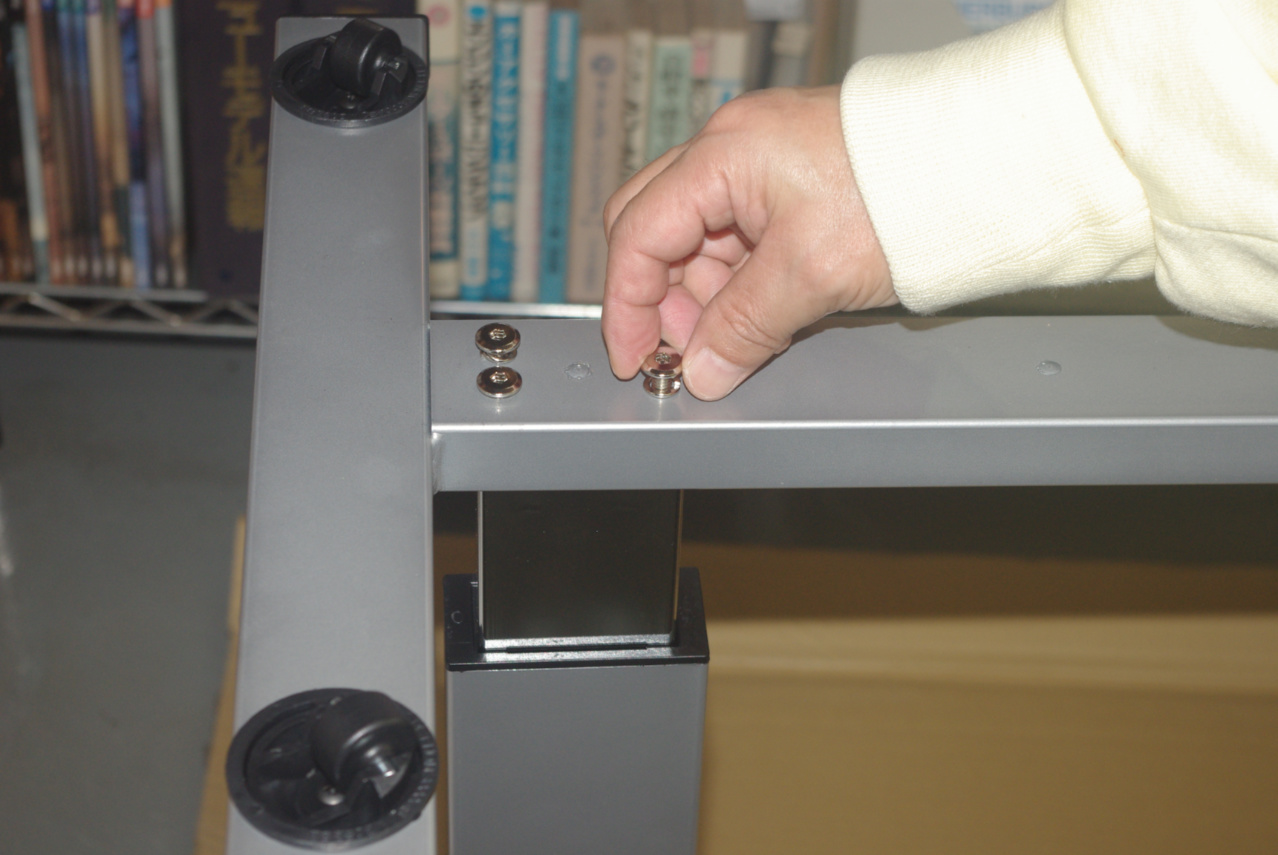 最後に支柱が逆さまになった状態のまま、ダンパー付き支柱の底部に、埋め込み型キャスター付きの脚部を取り付けます。