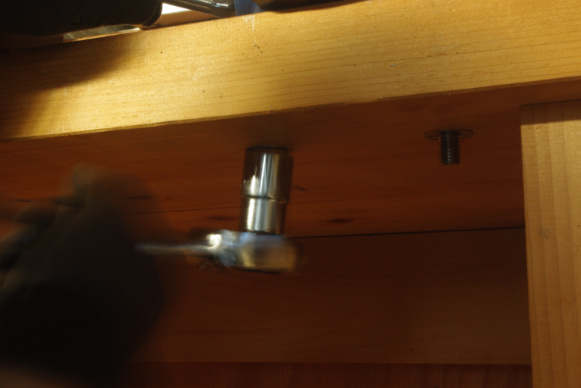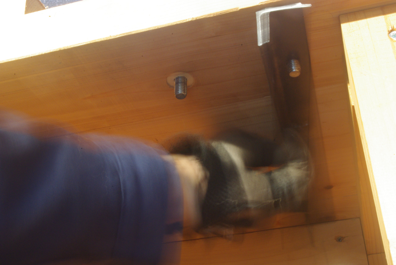 この画像は、作業台に取り付けている万力の固定用ボルトの下側のナットを取り外しているところです。
