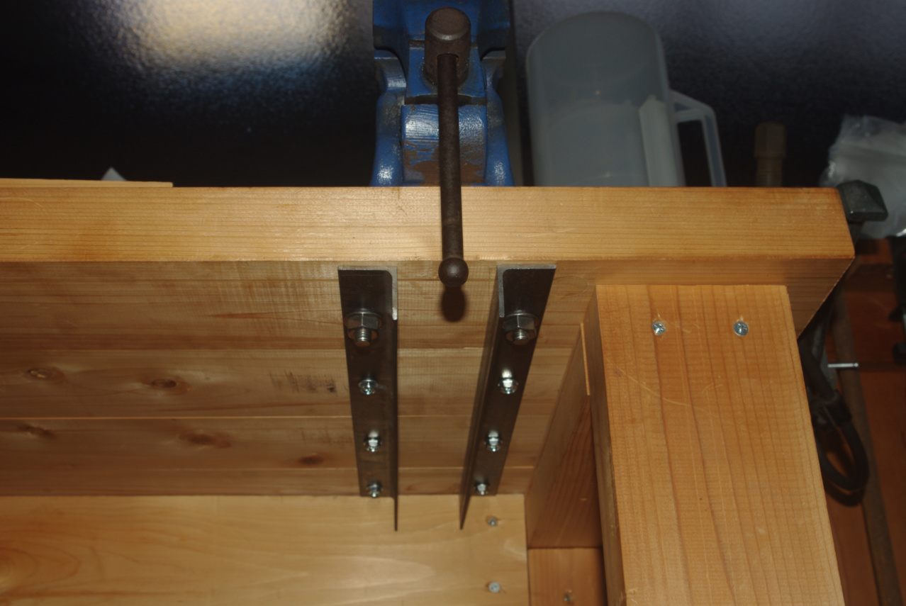 前回、万力にk012メタルブレーキを固定して作業した際に、板矧ぎ天板なので万力を固定しているのが手前の角材一本だけですので、万力に掛かった力が手前の角材のみに集中してしまい、そのままではなんと板矧ぎが剥がれそうになってしまうことが判明しました。
