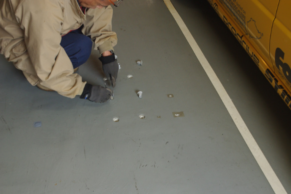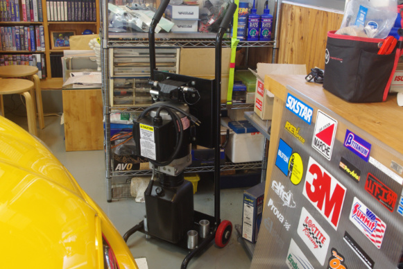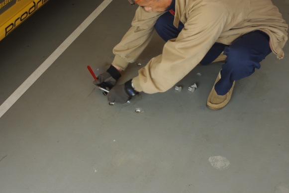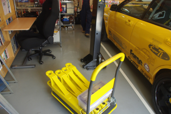 ボルトは、手前の台車に載ったリフトアームの上に見える半透明の樹脂製ツールボックスの中に入っています。