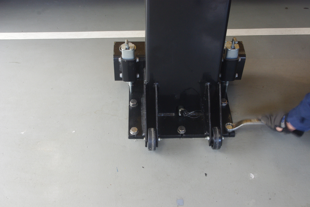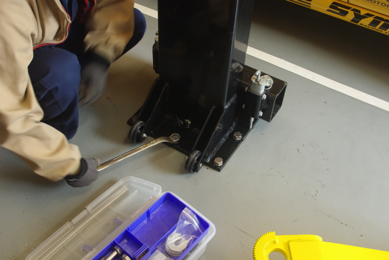 次にリフトの支柱を、台座のボルト穴と床のアンカーが一致するように立てます。