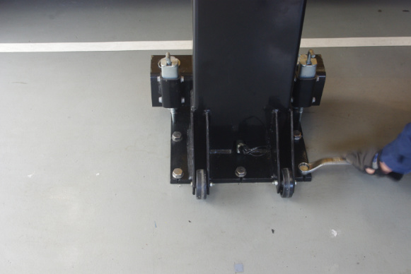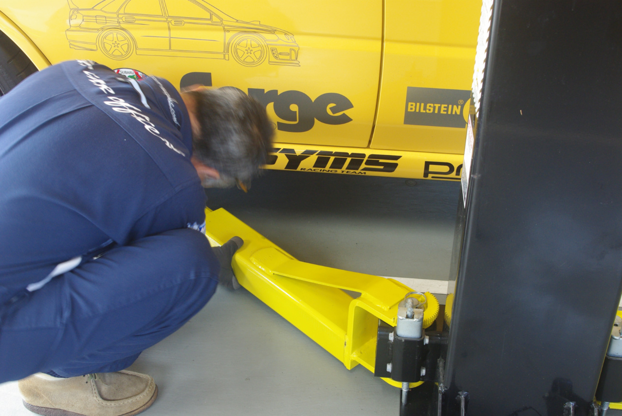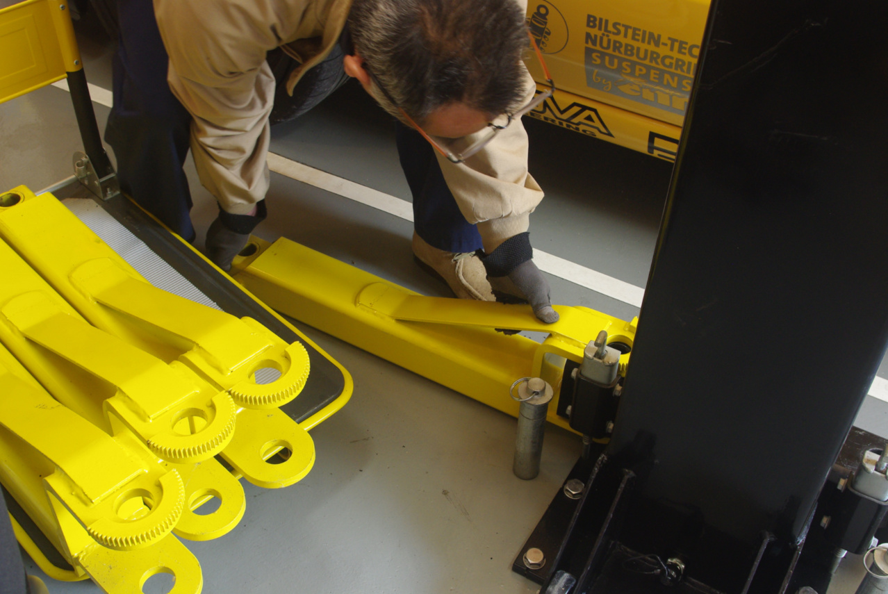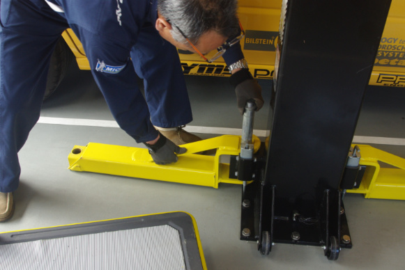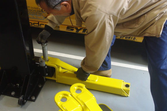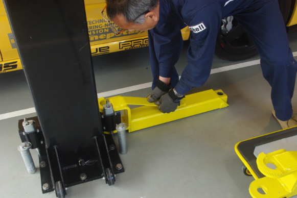次にリフトアームに車両受け台を取り付け、設置したリフトアームを動かして車両の前部ジャッキアップポイントに正確に合わせて設置します。