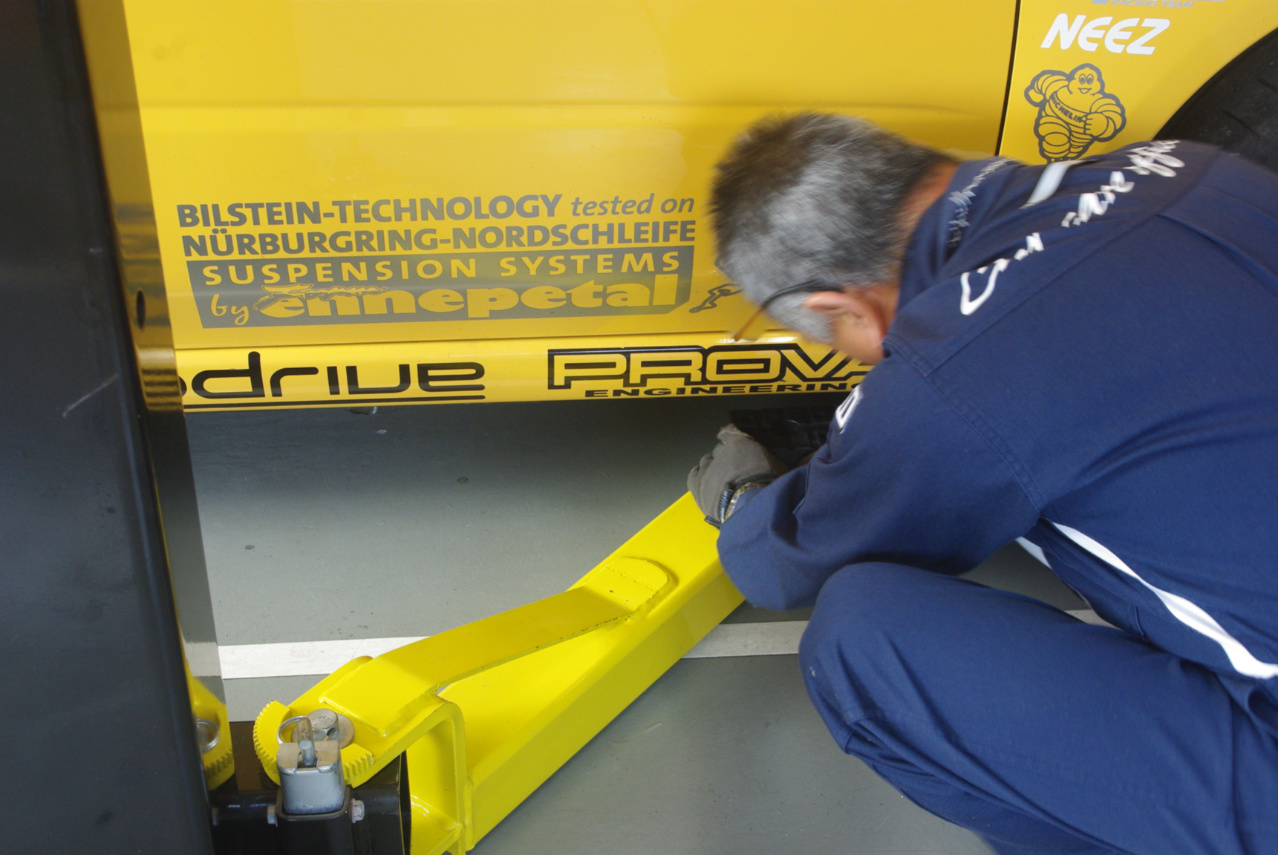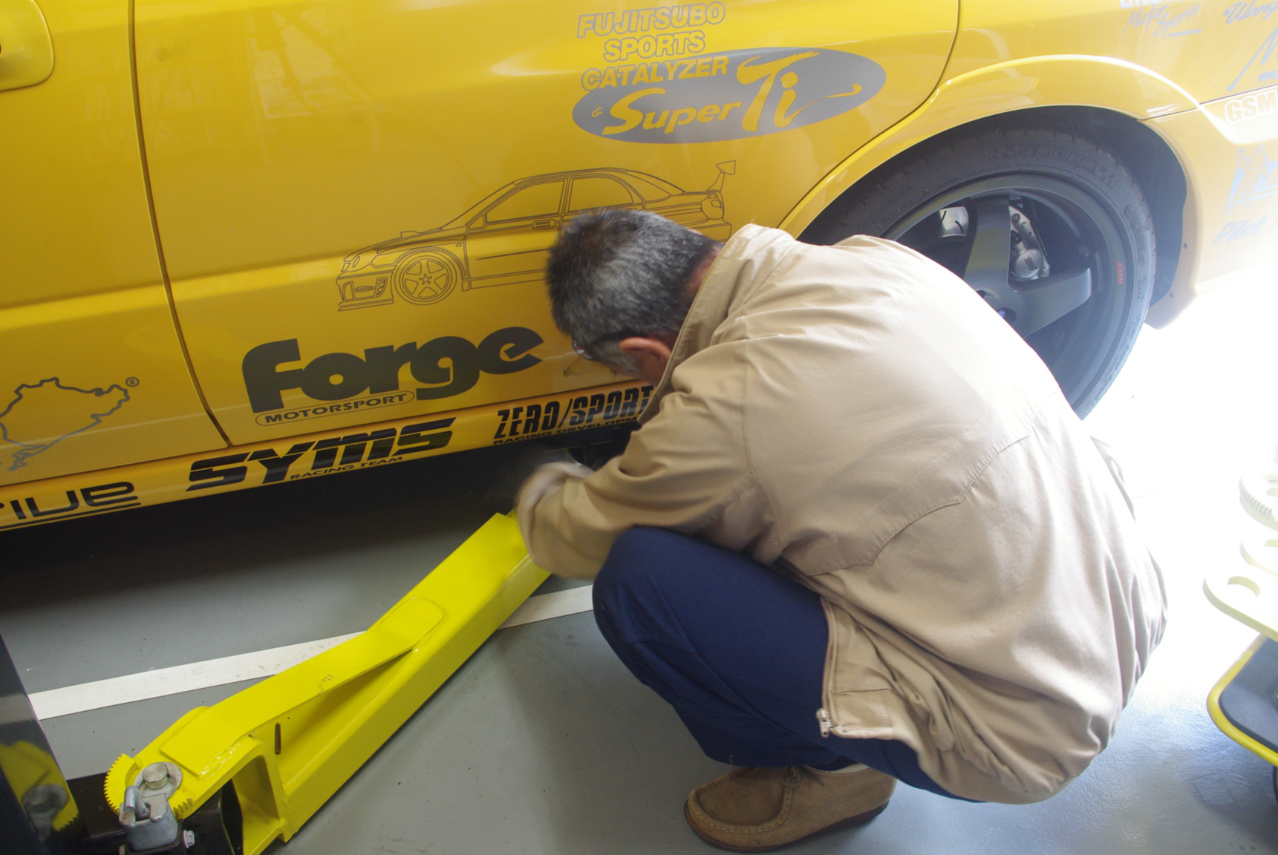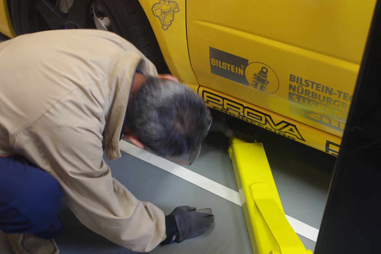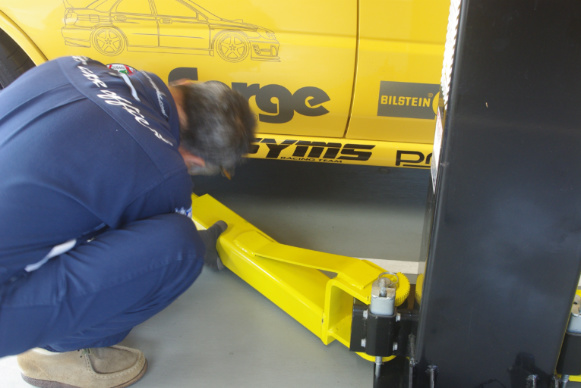 車両の左右2箇所づつのジャッキアップポイントに、それぞれのリフトアーム車両受け台が確実にコンタクトしているか確認しながら慎重にリフトアップしています。