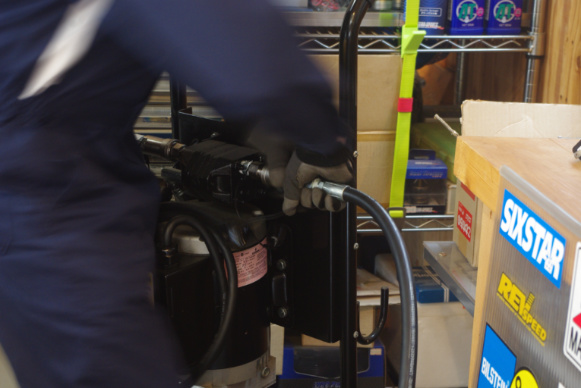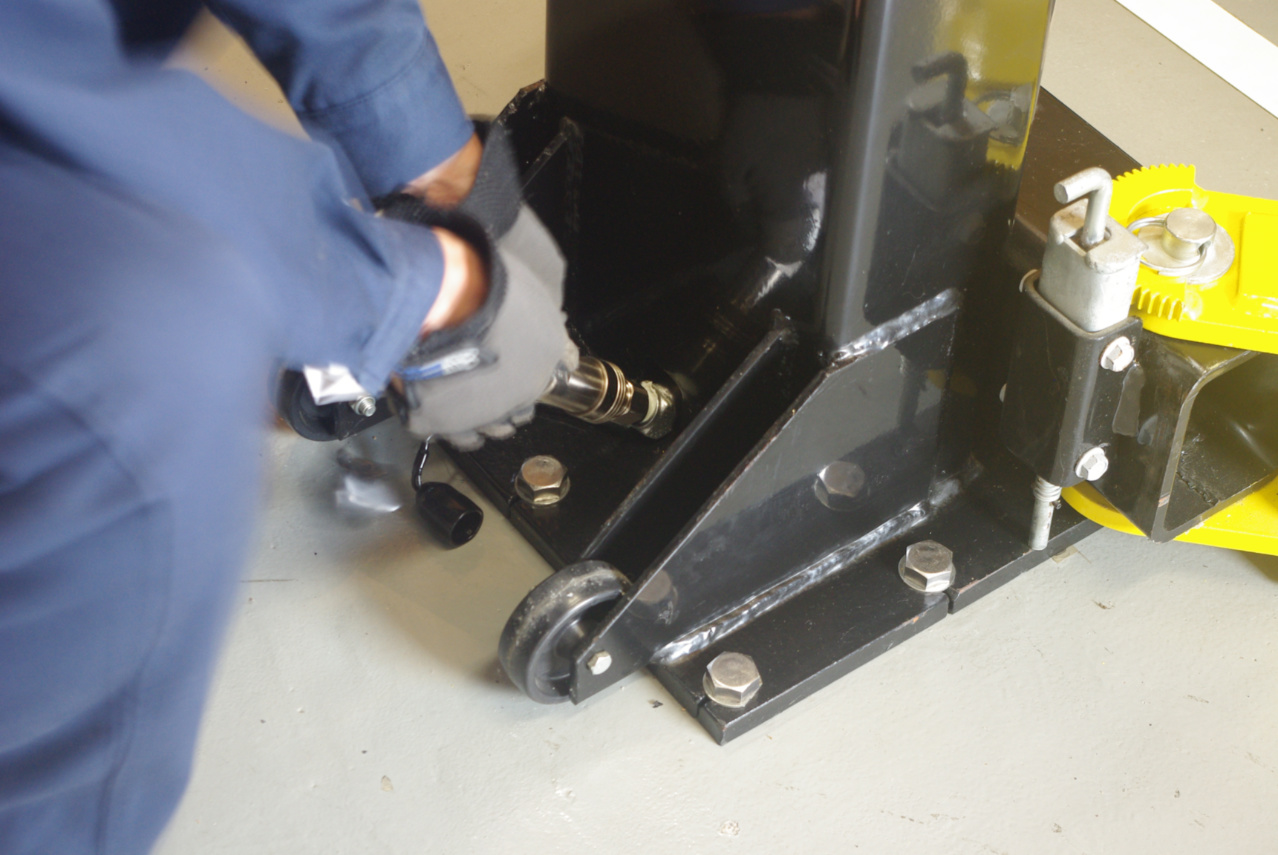 まず車両右側の支柱シリンダーに油圧ホースのカプラーを接続しました。