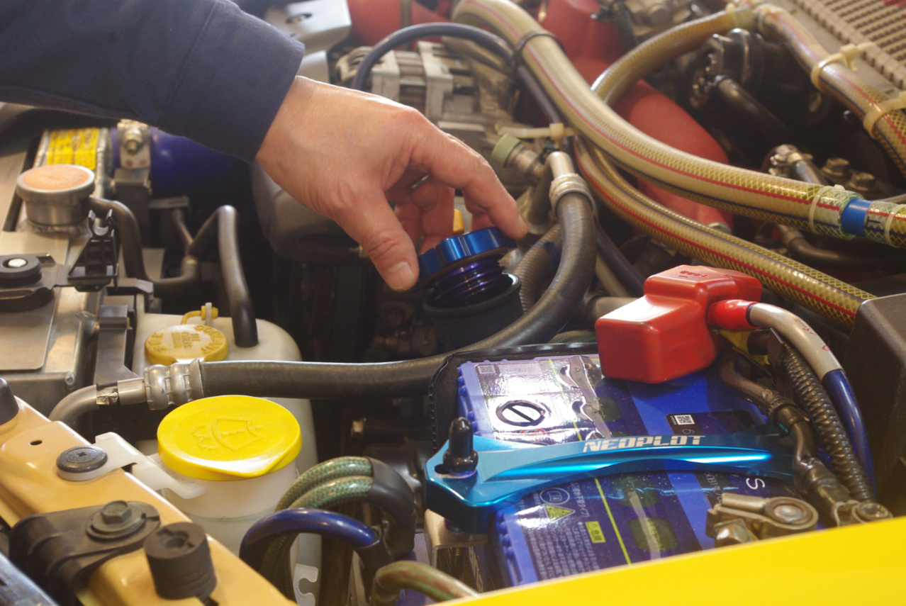 オイルフィラーキャップを外して、オイル排出のために大気圧を掛けます。