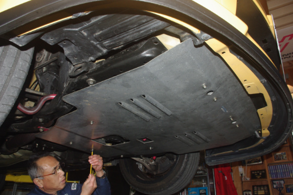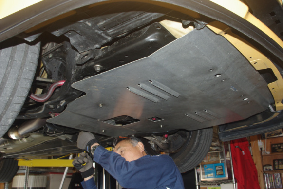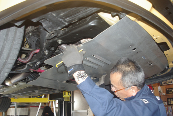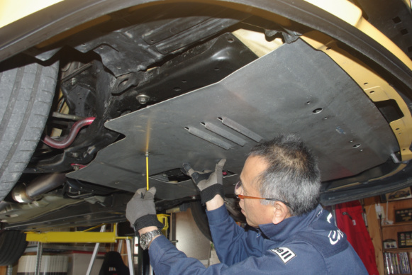 これも毎回同様ですが、オイル交換の作業に入る前に、下回りの簡単な清掃とチェックをしています。