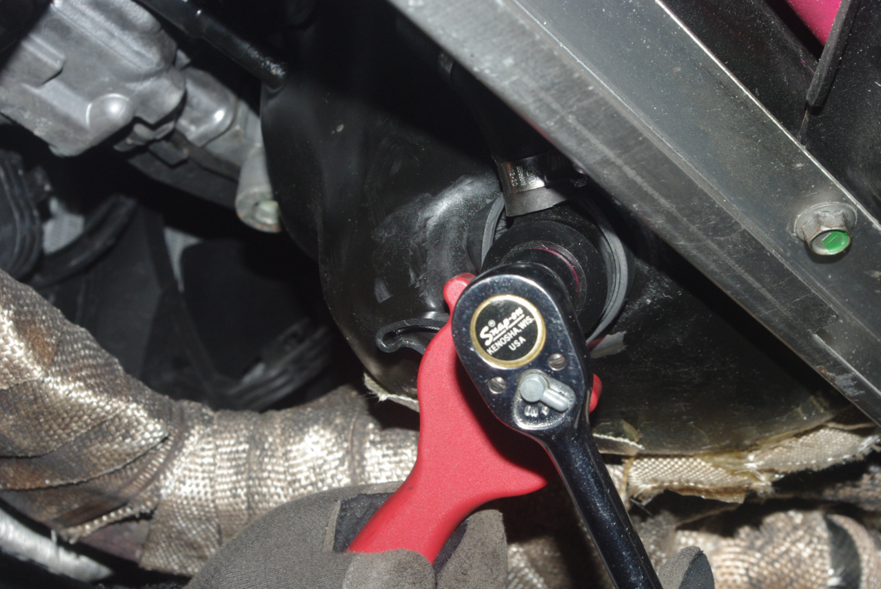 次にオイルドレンタンクと受け皿を真下にセットして、エンジンオイルドレンプラグを取り外しました。