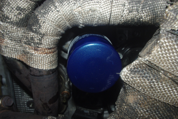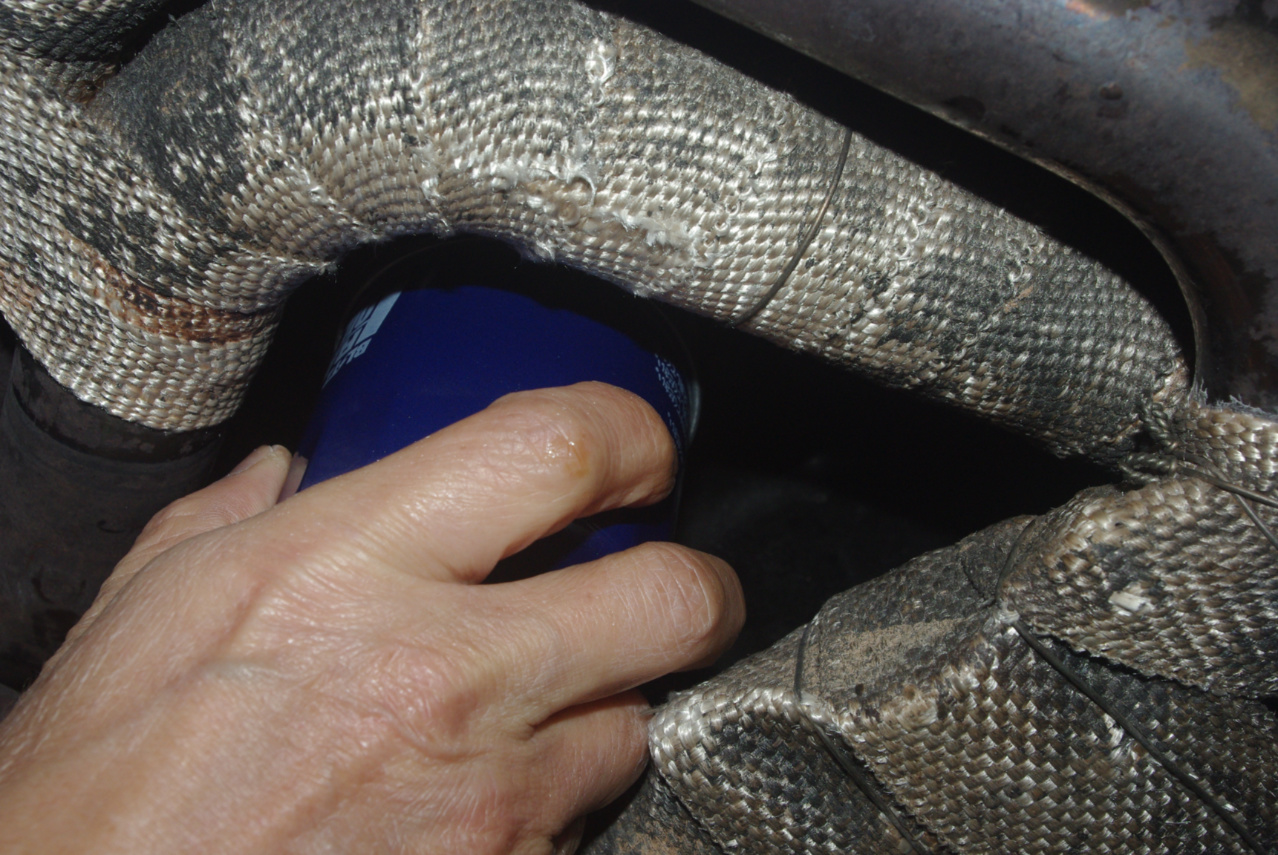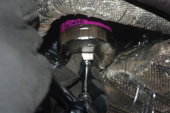 お約束のラップでEXマニにオイル付着防止のカバーを施し、レンチでフィルターを緩めます。