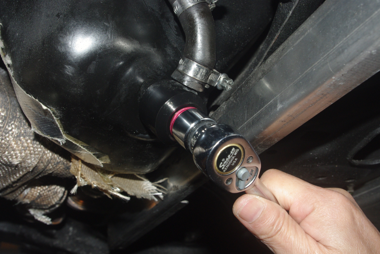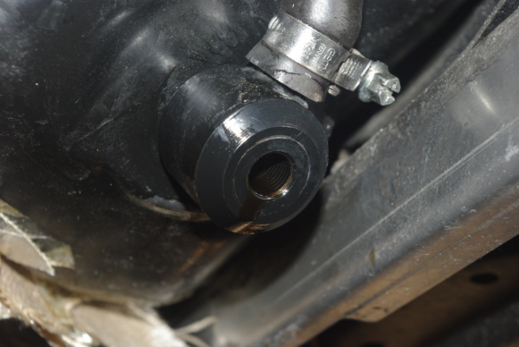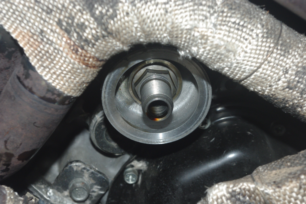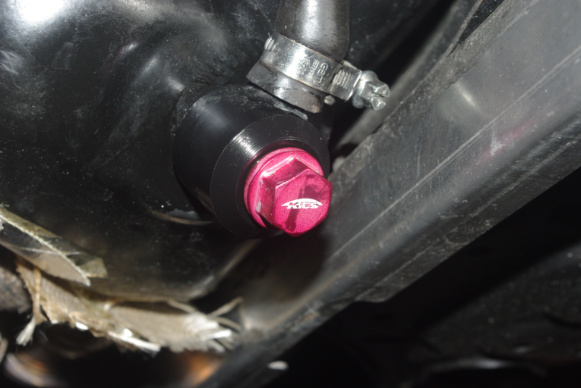 本来のエンジンオイル排出口には、オイルミストセパレーターのオイルリターンアダプターが装着され、そこに純正サイズではないオイルドレンプラグが取り付けられています。