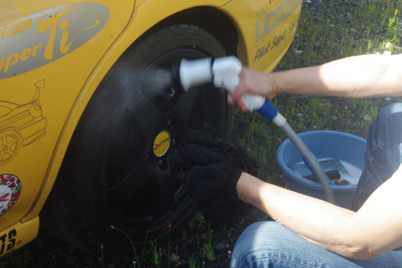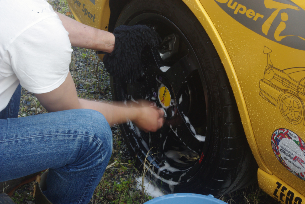 リヤホイールの洗浄は、ブレーキキャリパーとローターが小さい分、ホイール内側のスペースに余裕があり、新兵器の活躍の場が広がります。