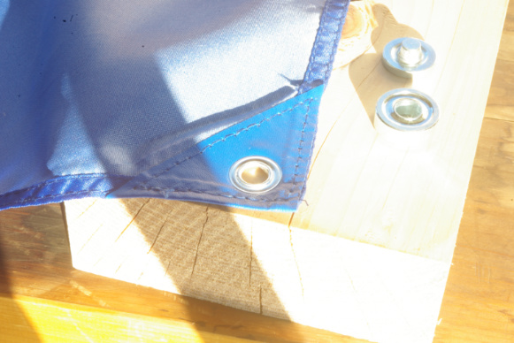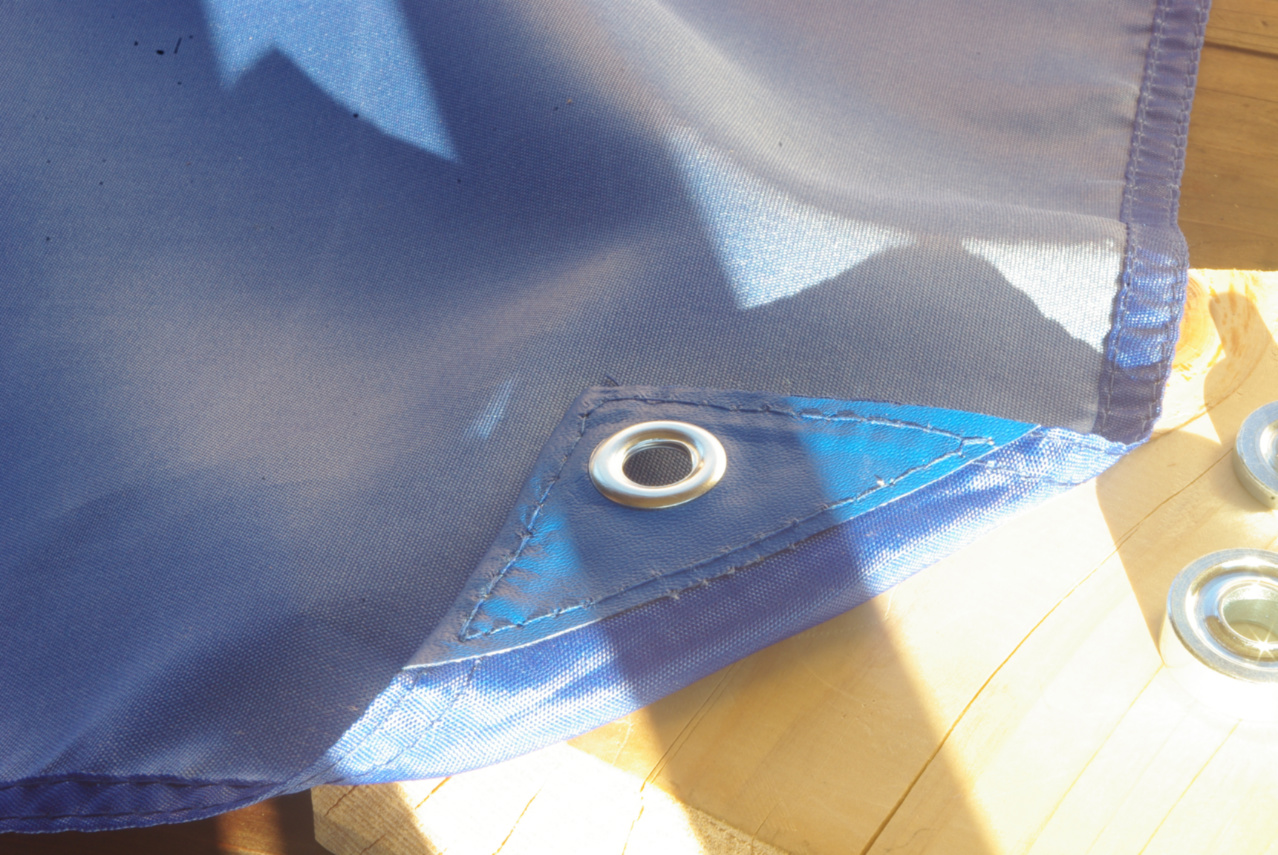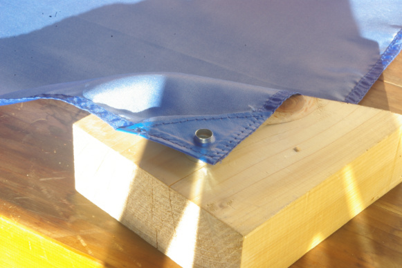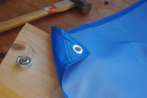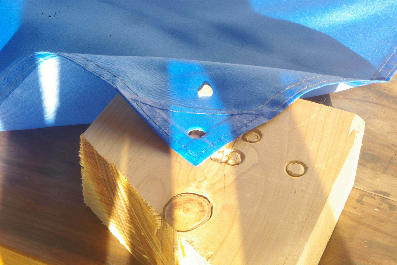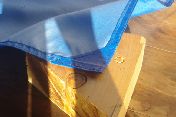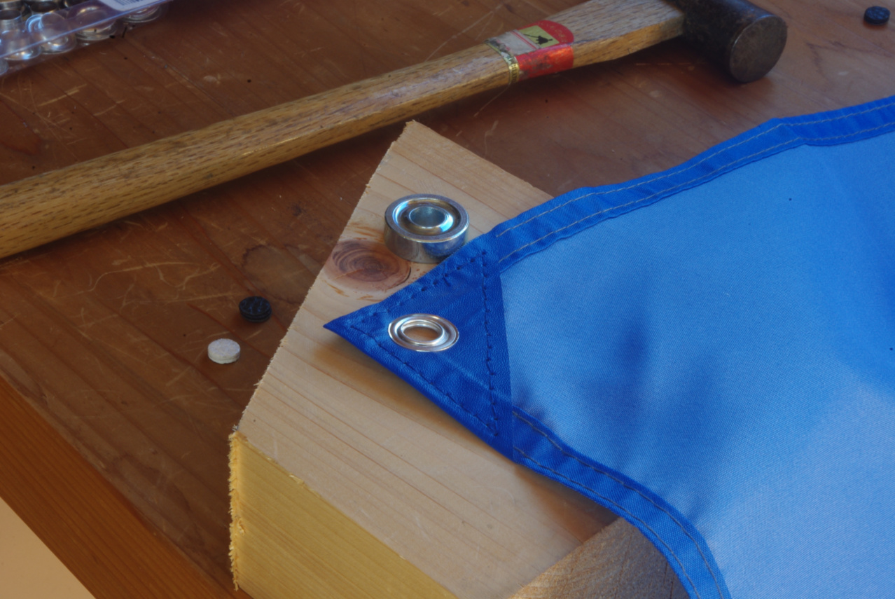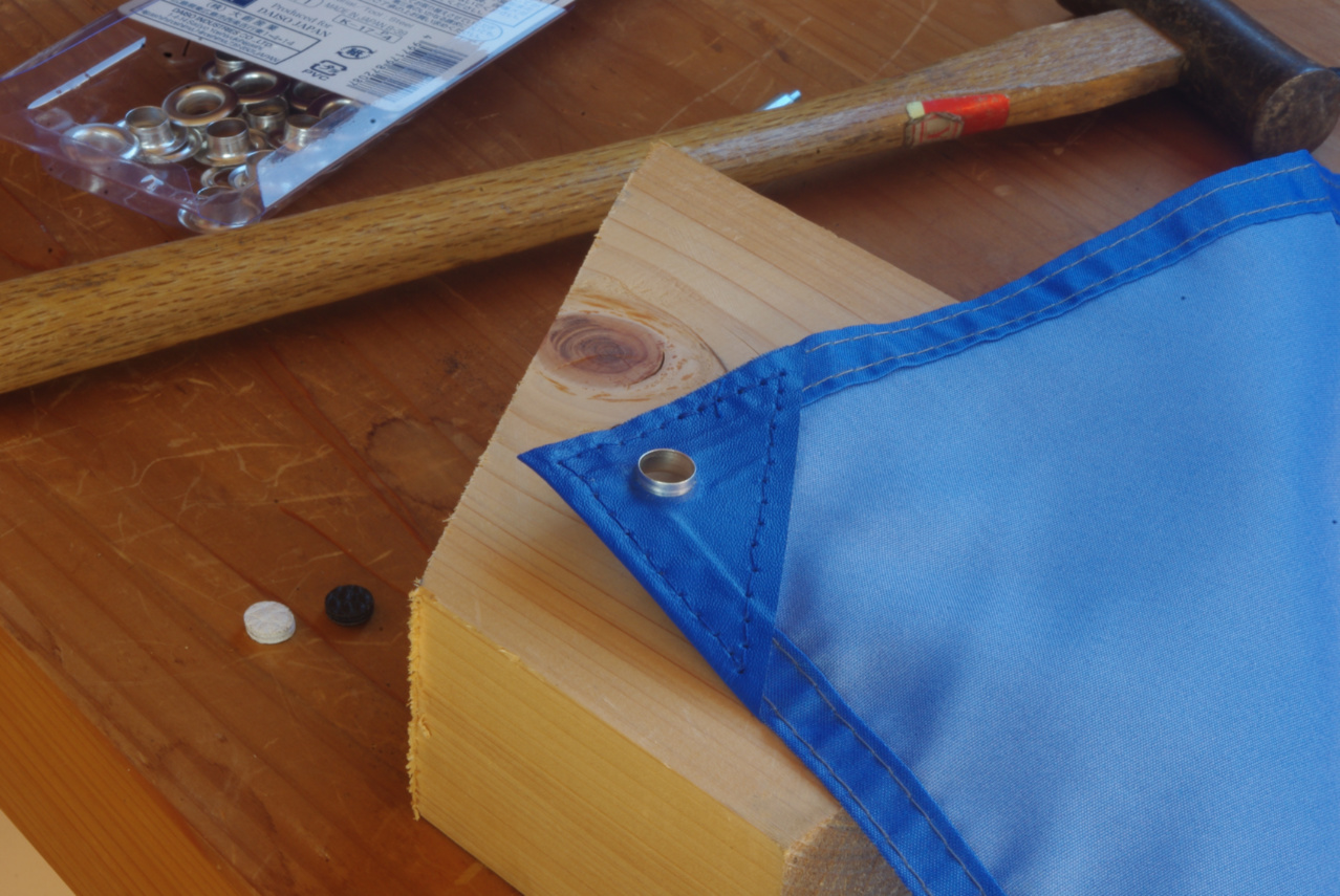 六連星フラッグと同日にレザー補強して、この日ハトメ加工を実施しました。