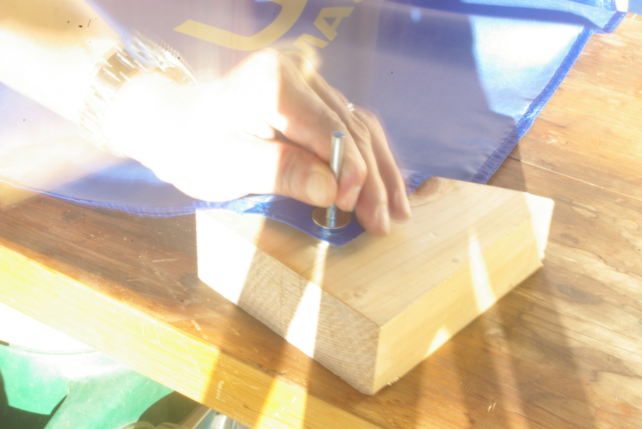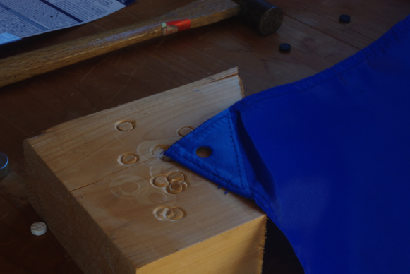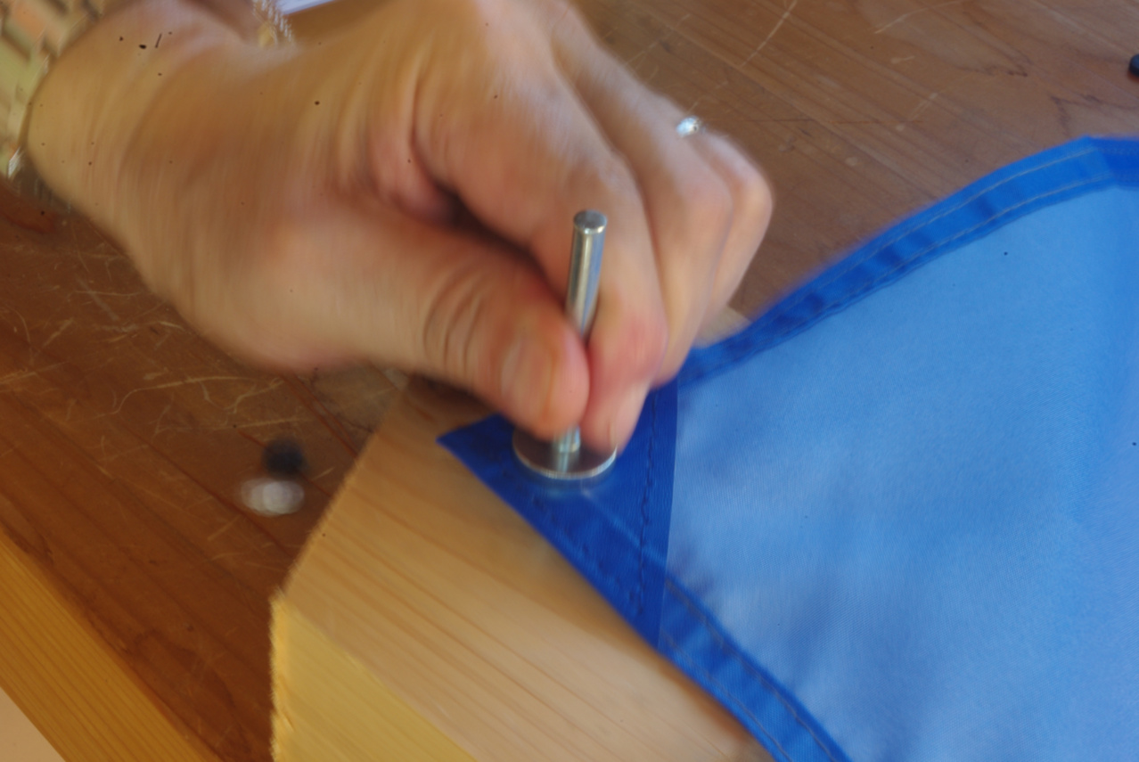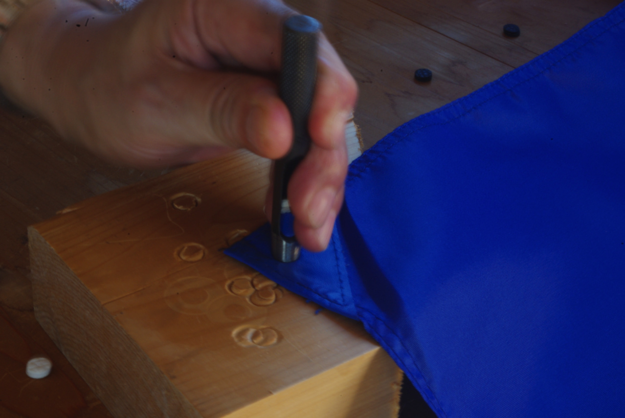 ハトメ裏側金具を嵌め込んで、器具を使って打ち込みました。