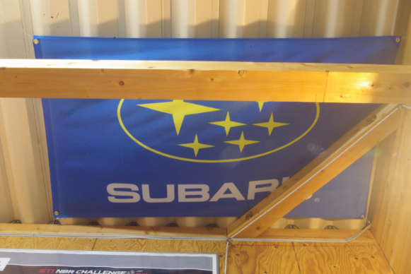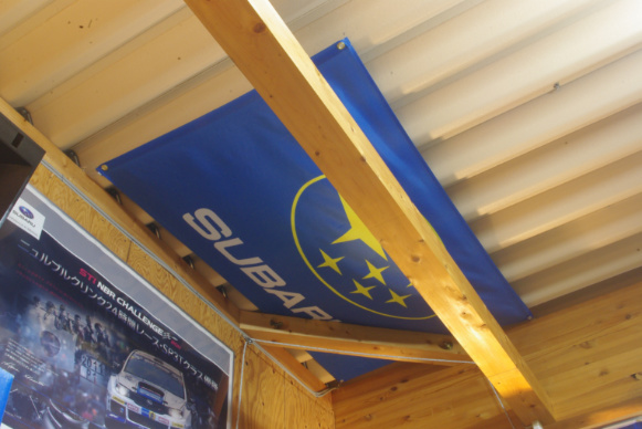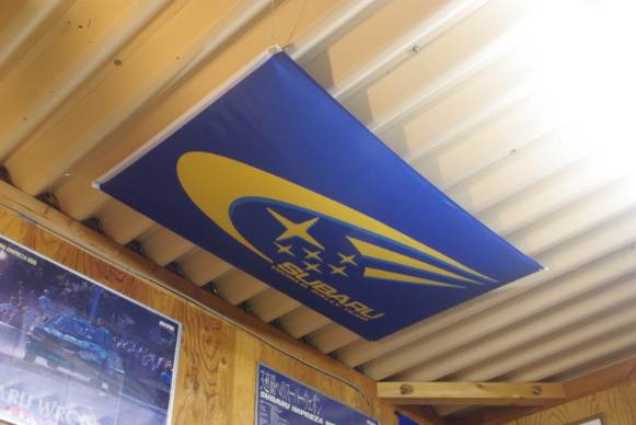 やはりこれだけ高さのある天井に掲示すると、ガレージのどの場所からでも目に付きますので、単に華やかになっただけでなく、SUBARUをアピールすることにしっかり寄与していると思います。