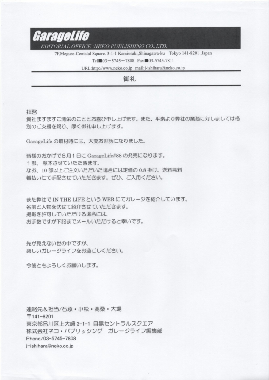 予定通り本日Garage Life石原 氏から、Garage Life 6月1日発売号の掲載記事のゲラがメールで届きました。