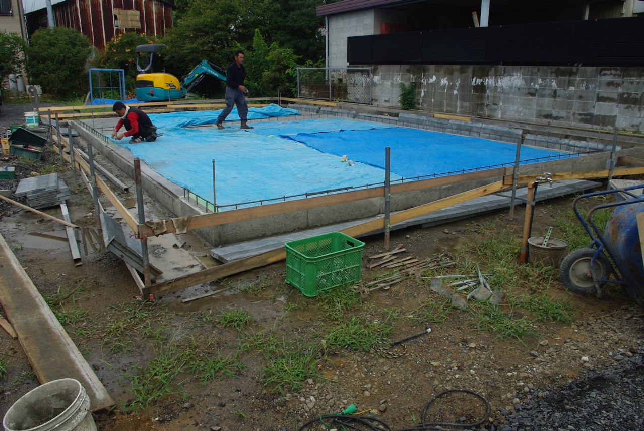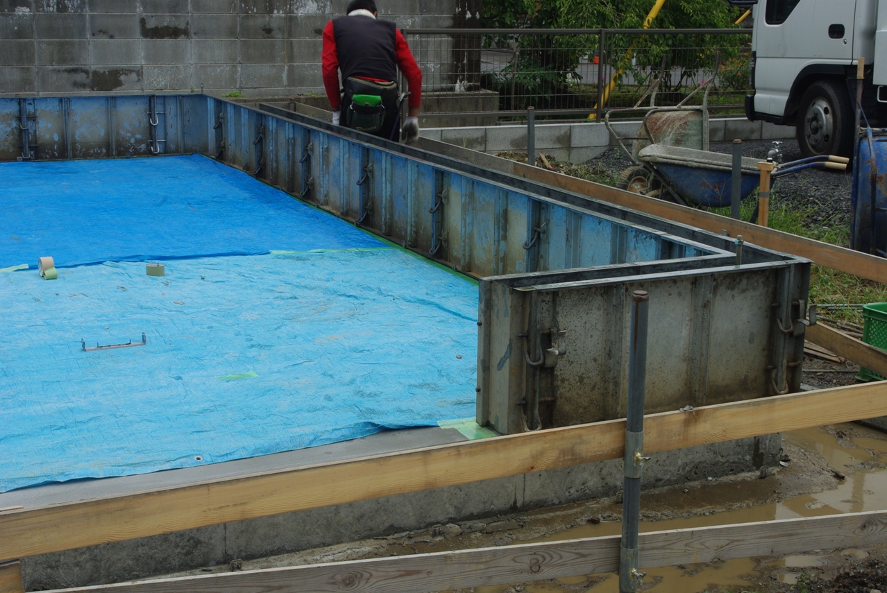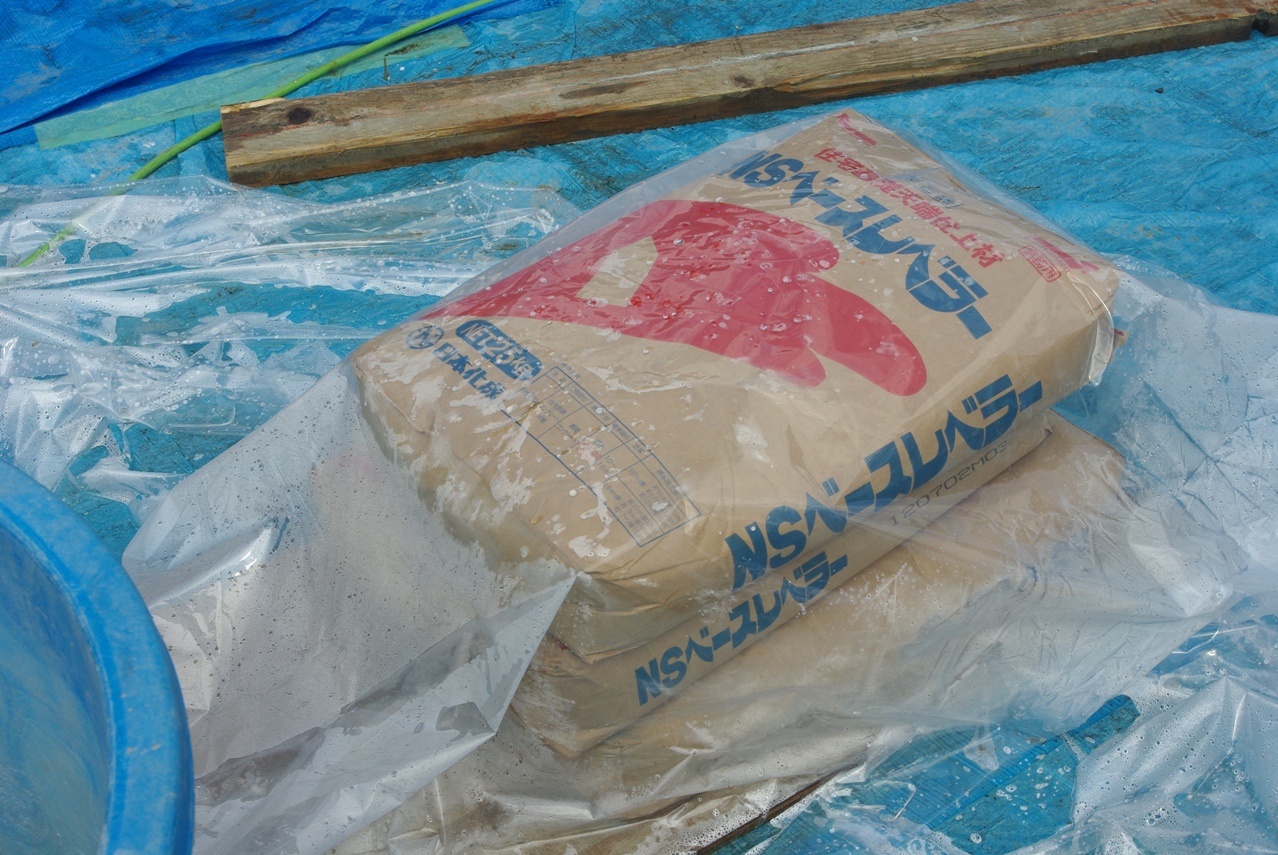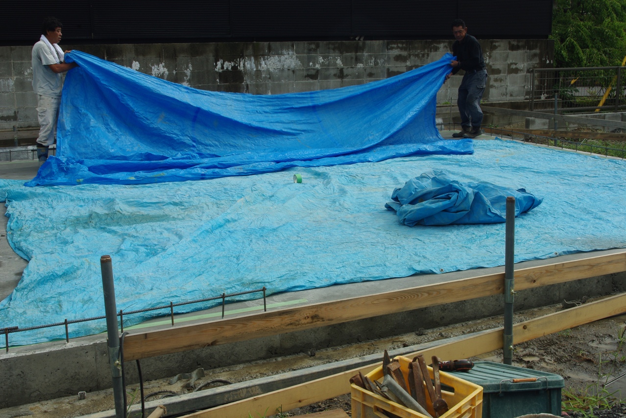 ベースレベラーの打ち込みが終わって、再び防水用にビニールで型枠を覆いました。