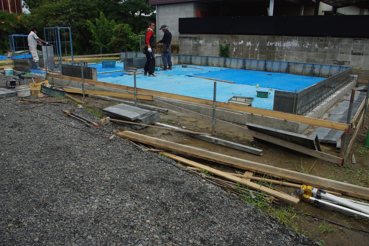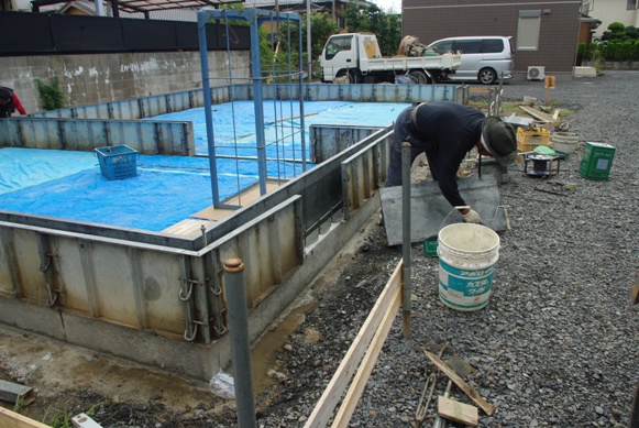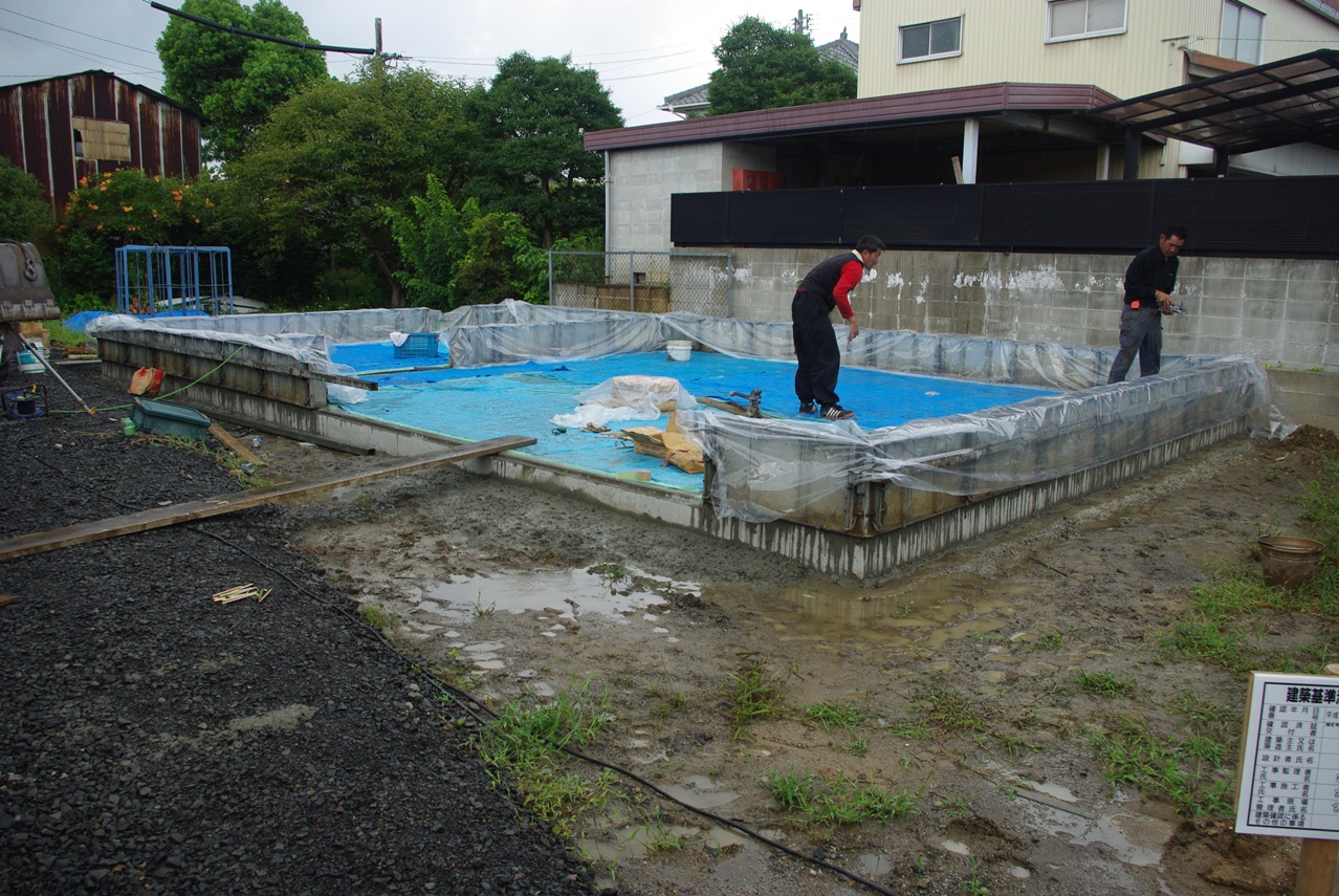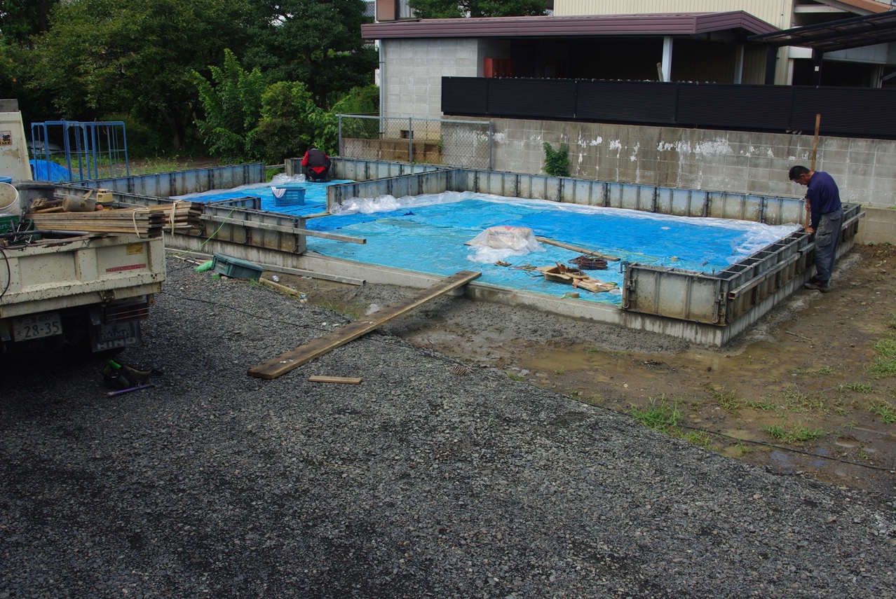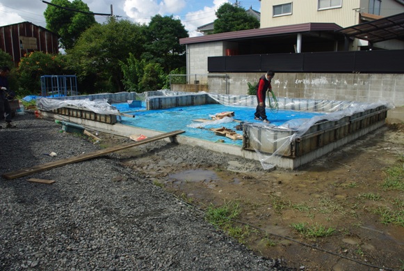 ベースレベラーの打ち込みが終わって、再び防水用にビニールで型枠を覆いました。