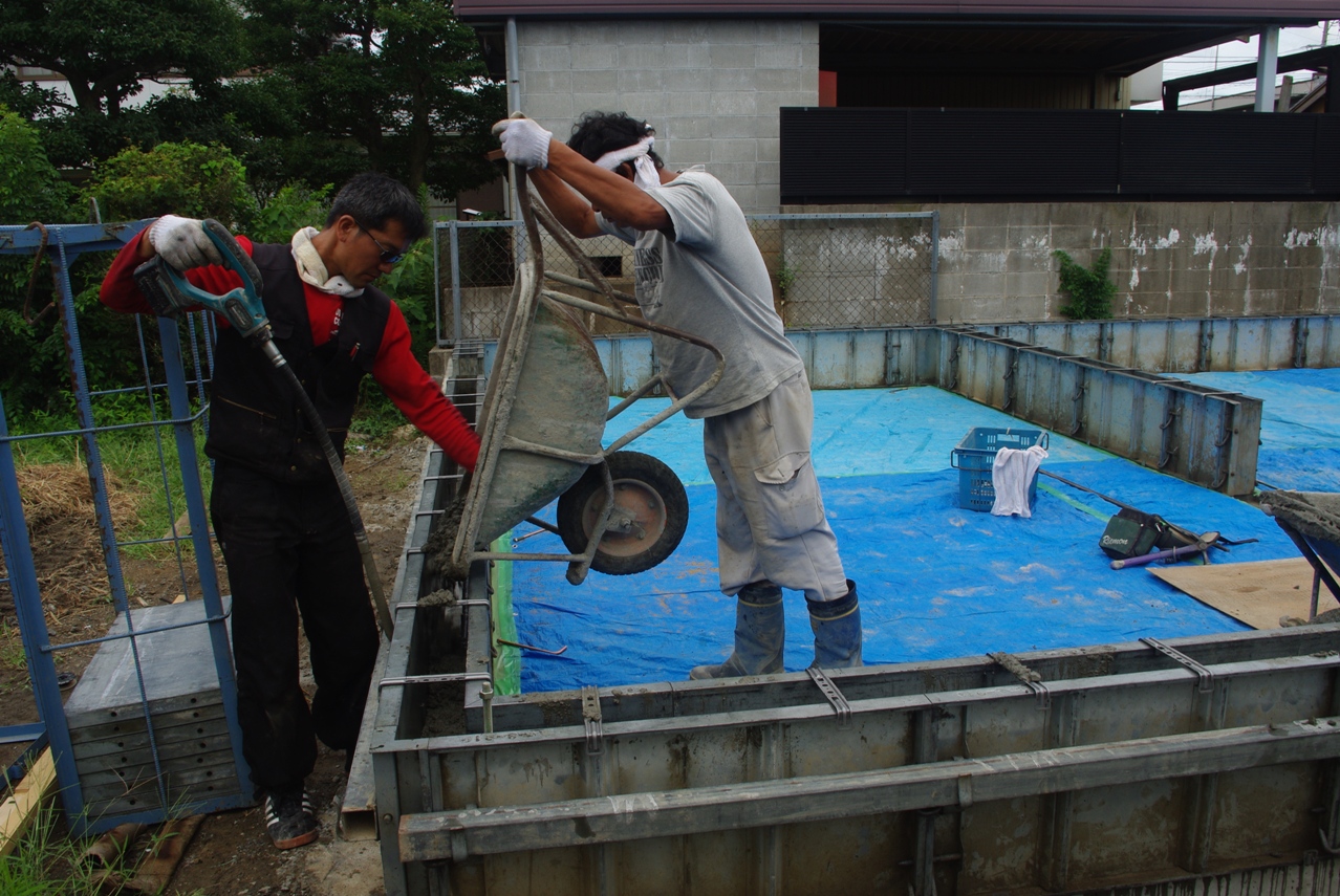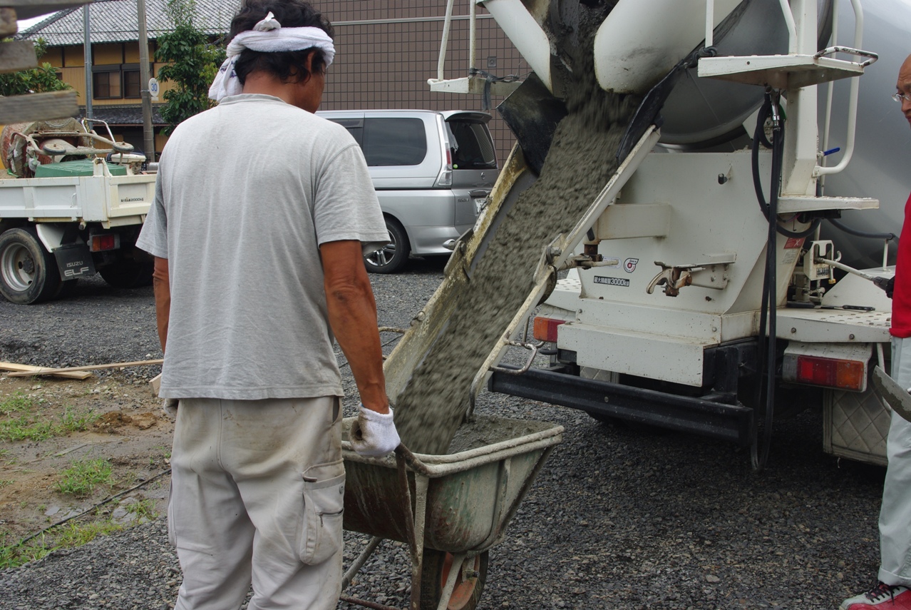 コンクリートの量が少ないので、ポンプ車ではなく全て一輪車を使って作業をします。
