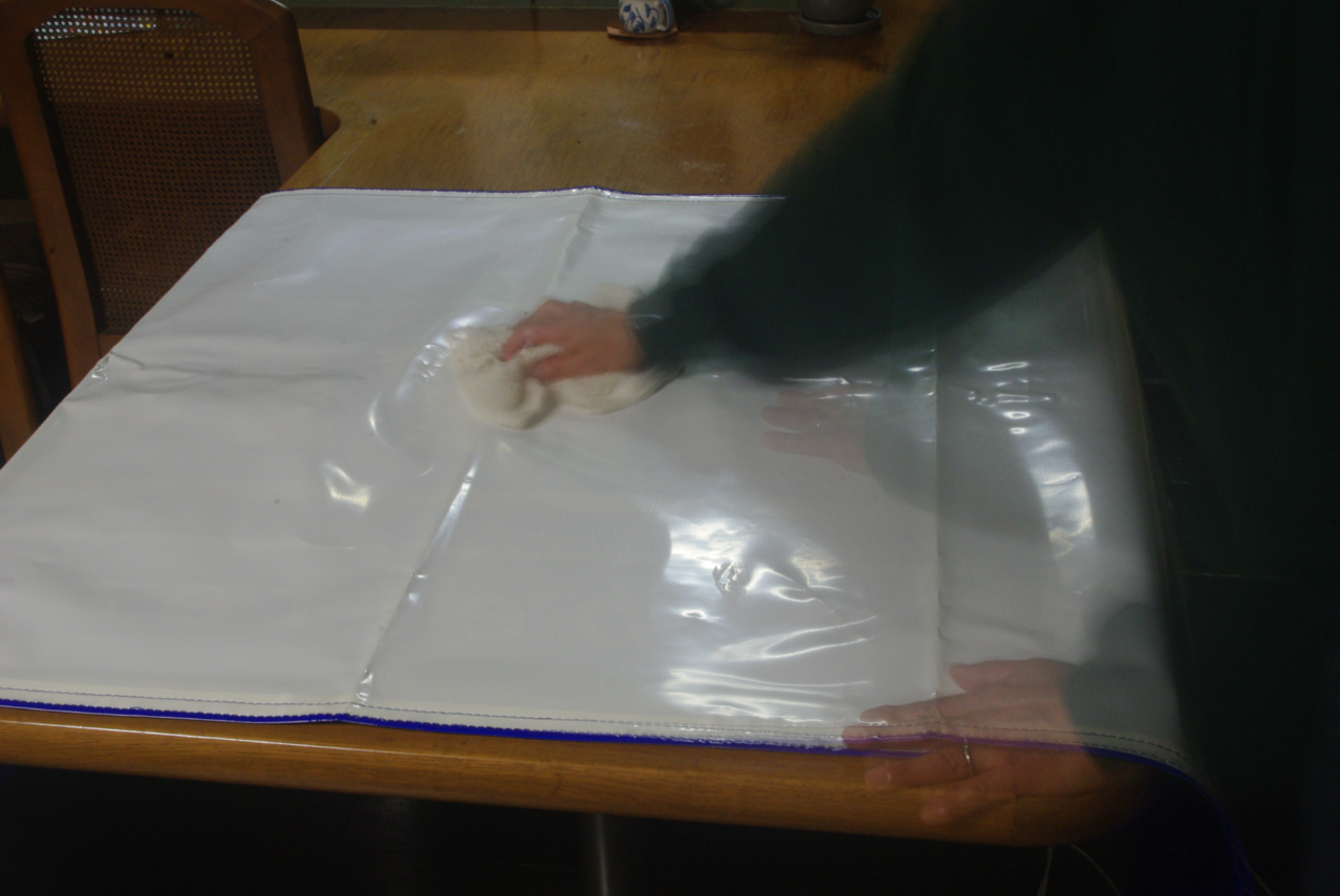 お陰さまで相当シートの面積があるにも拘わらず、効率よくかつ効果的に蒸しタオルによるビニールシートのプレス作業が行えました。♪