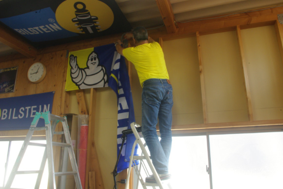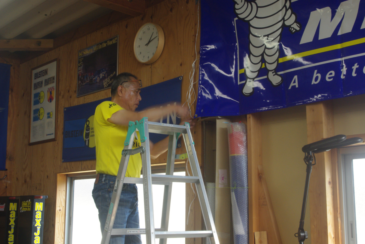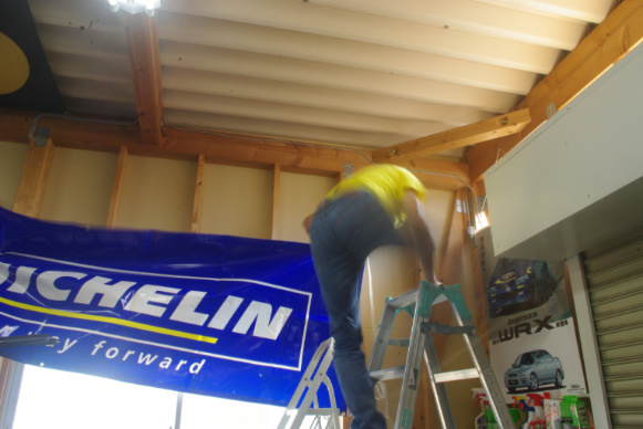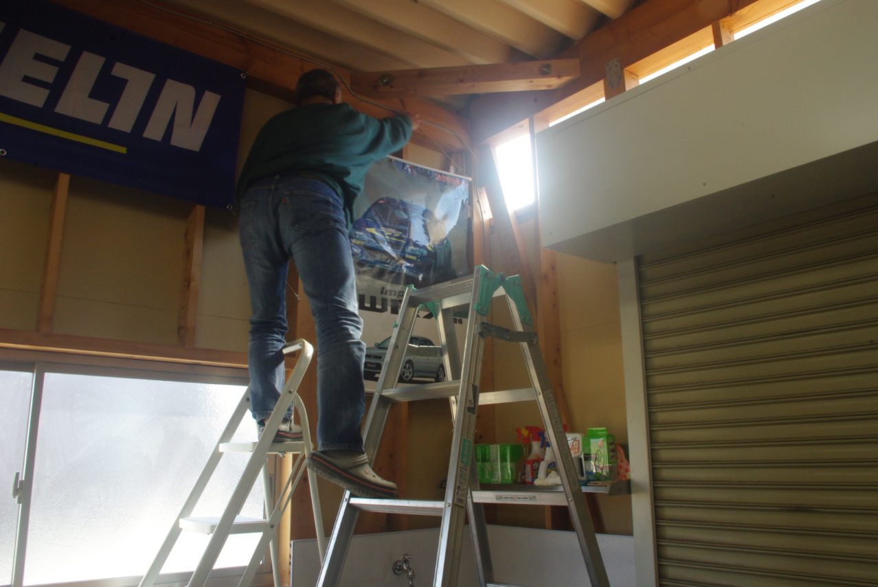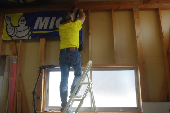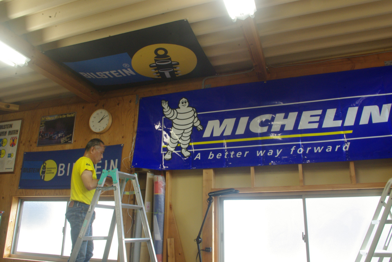 明けまして翌日のお昼頃、昨日到着しましたMICHELIN vinyl banner をガレージ壁面へ掲示する作業に取り掛かりました。