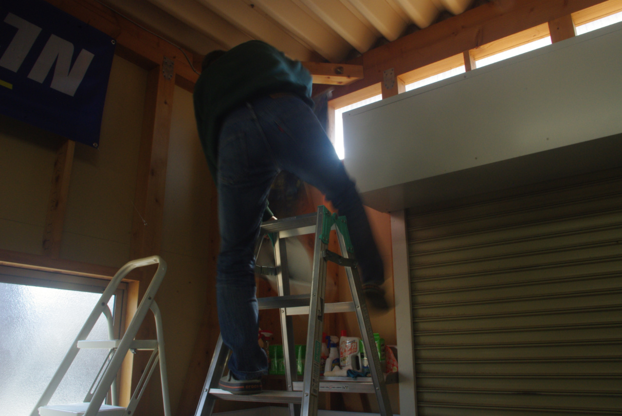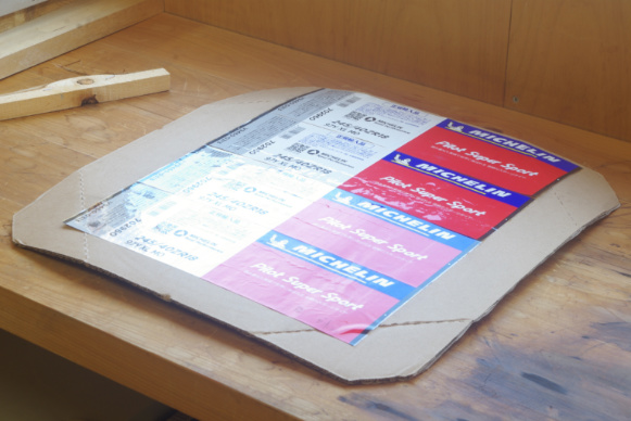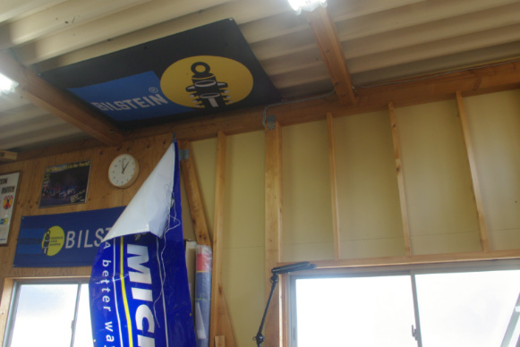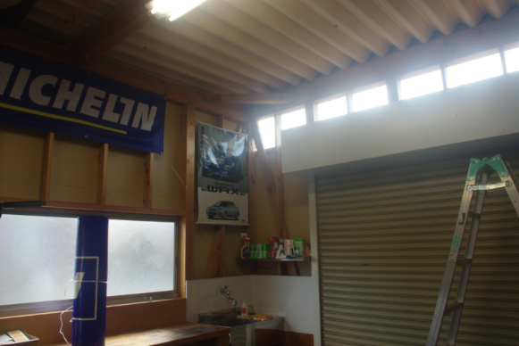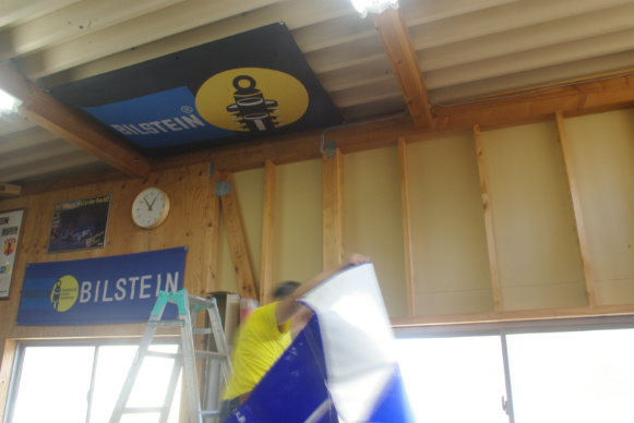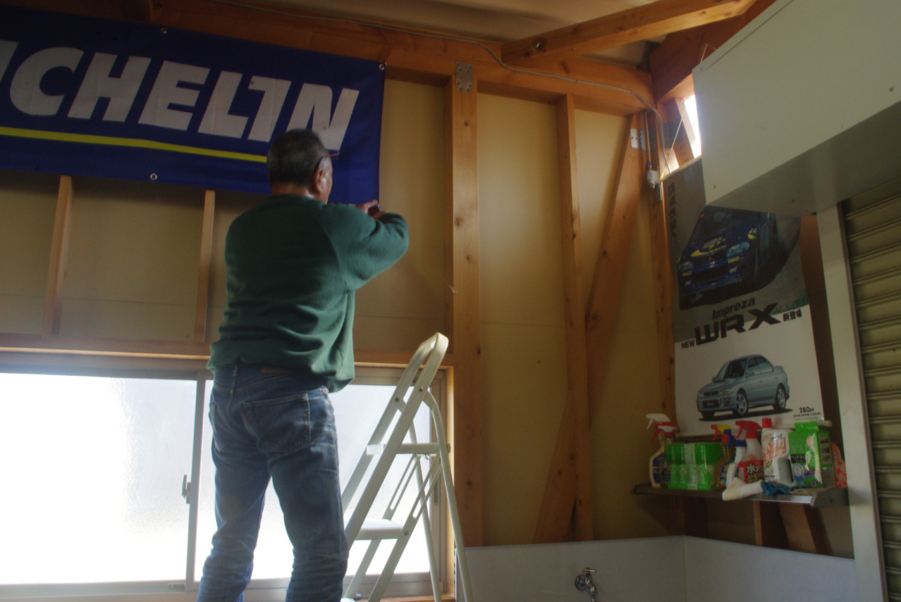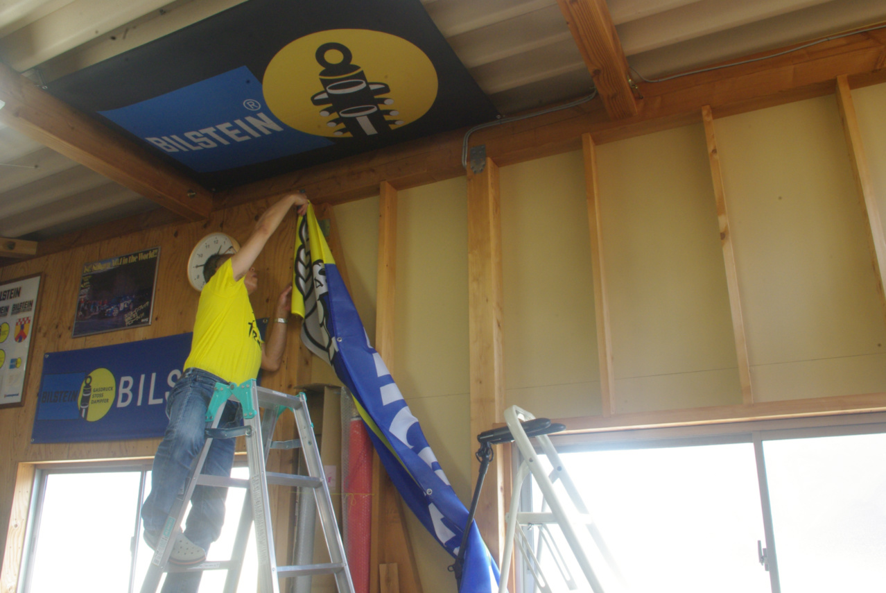 明けまして翌日のお昼頃、昨日到着しましたMICHELIN vinyl banner をガレージ壁面へ掲示する作業に取り掛かりました。