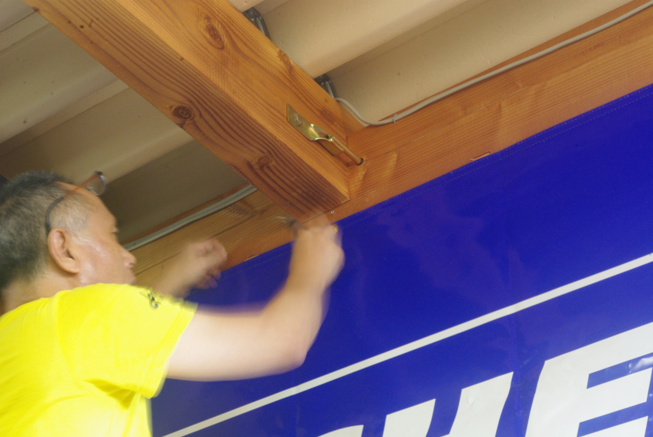 そのためか上辺両端を引っ張って固定しただけでも、バナーの中央部分のたるみや垂れ下がりはほとんどありません。