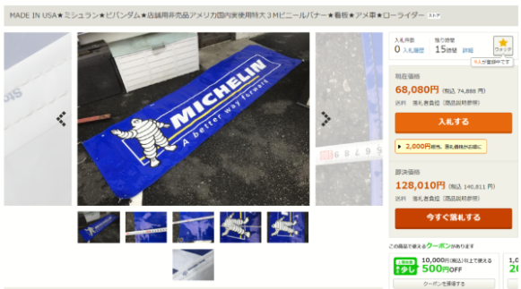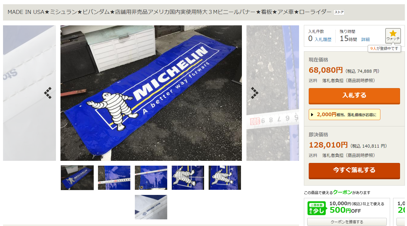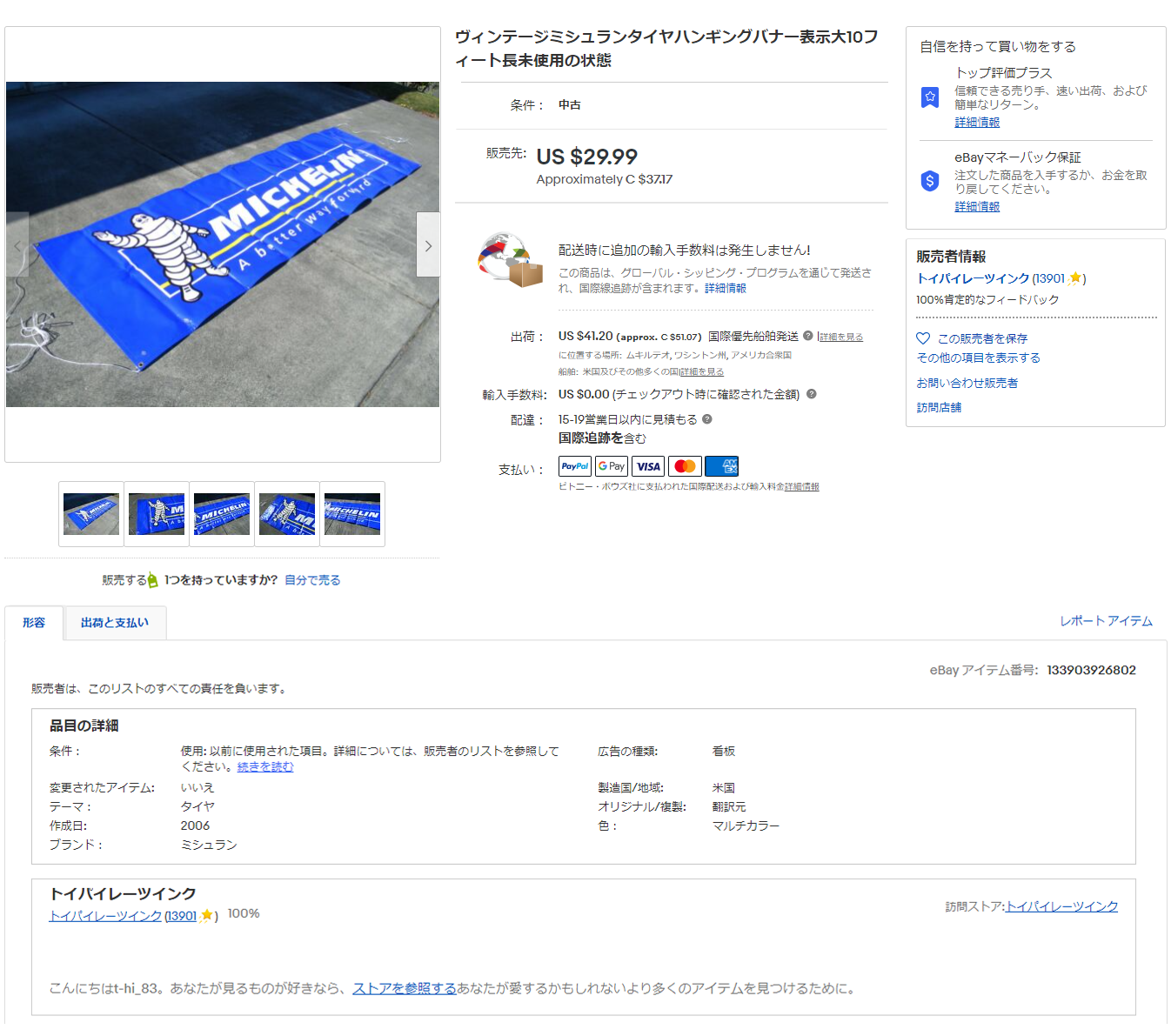 そこで思いついたのは、海外のネットショップ等でヒットするかもしれないと考えまして、「MICHELIN vinyl banner」でやや危険も承知の上ワード検索しましたところ、まさにこのeBayの出品ページがヒットしたという訳です。♪