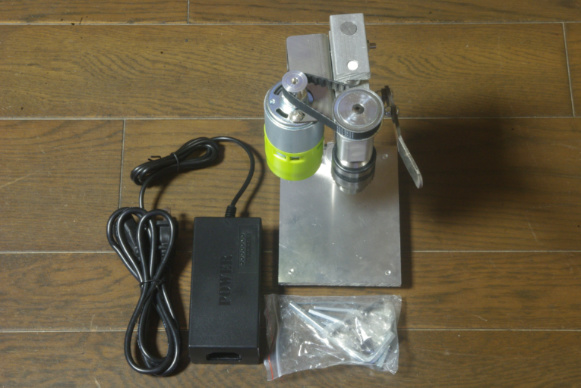 その他には、ドリル回転速度制御を兼ねたAC-DC電源アダプターと電源コード、そして数本のアーレンキとドリルチャックハンドルがビニール袋に入れてありました。