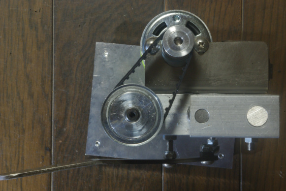これがボール盤の心臓部にあたる駆動モーターと、モーターの回転をドリルに伝えるためのコグドベルトと歯付きプーリーです。