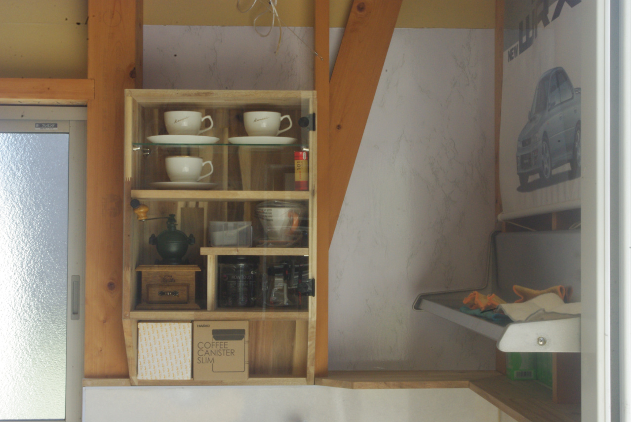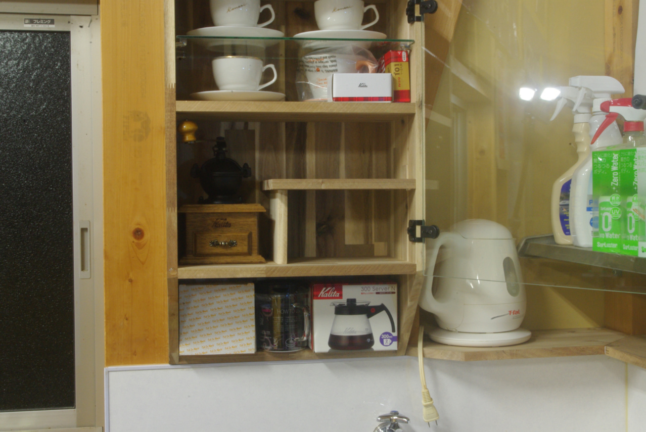 そしてこのことによりまして、この棚に並べて収納しておりましたコーヒーミルと電気ポットのうち、電気ポットを新設しました側の造付けオーダー棚に移動しております。