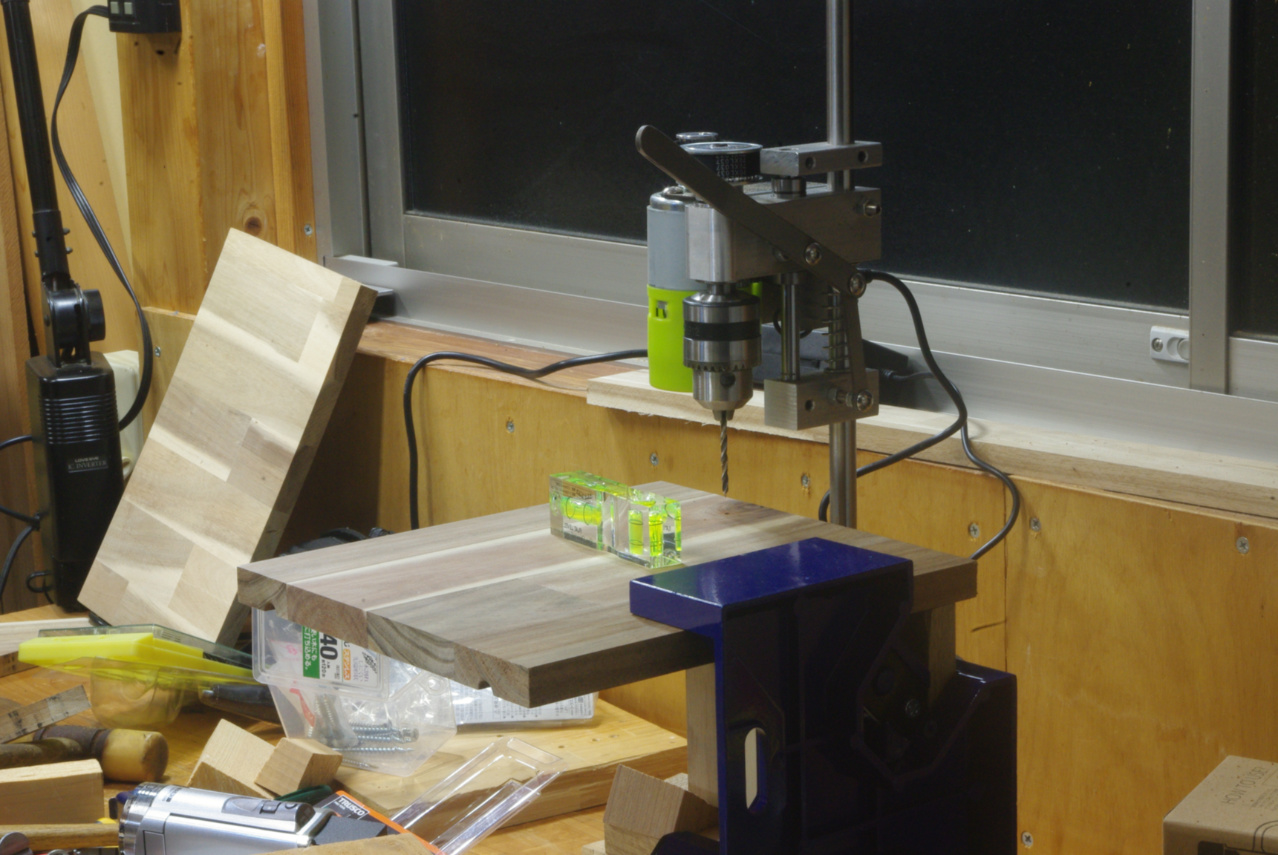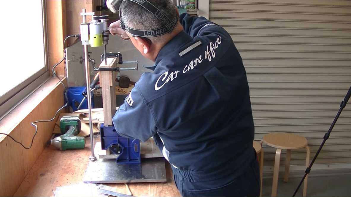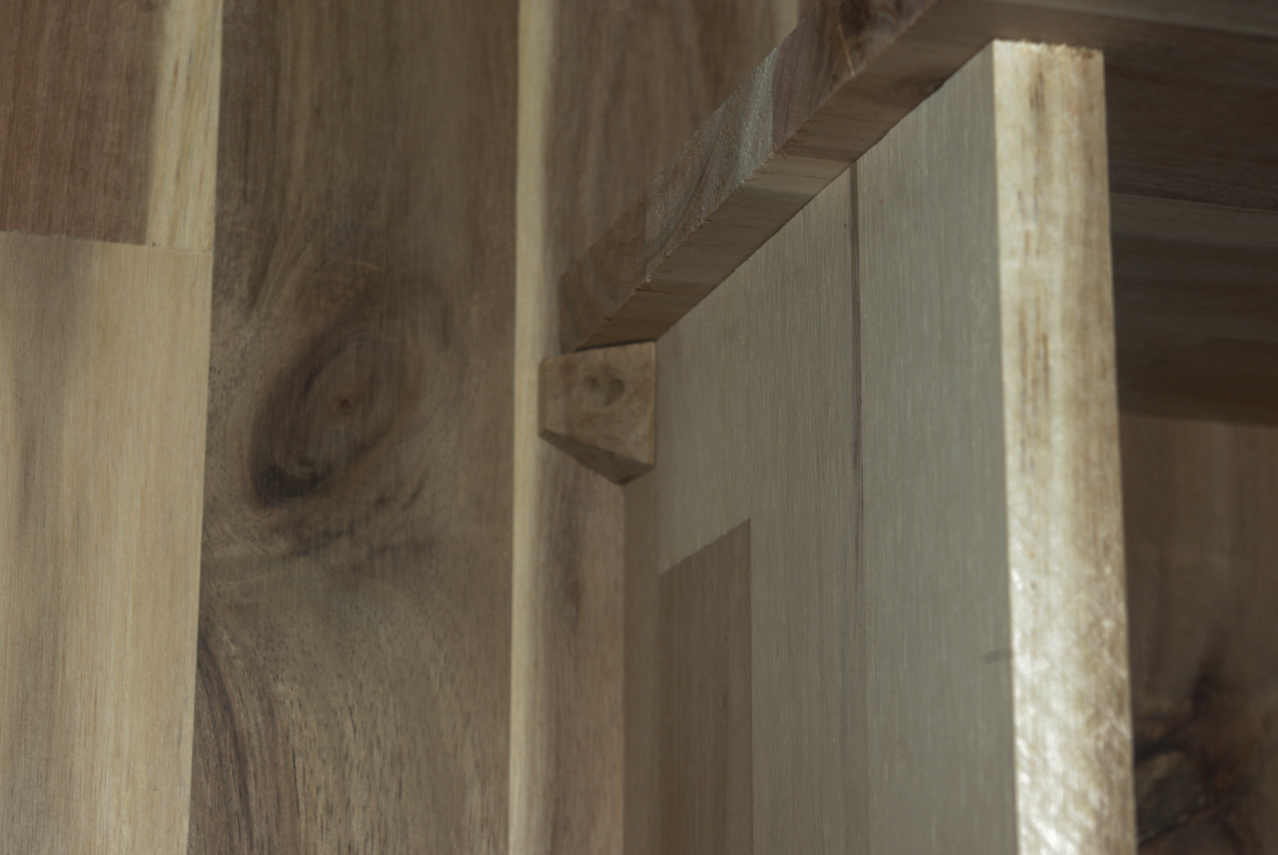 設置は小径のビスで固定しまして、ネジはご覧のように隠しネジ穴を設け、さらにそのネジ穴は同じアカシヤ材から削り出したダボ材で完璧な隠しネジ仕様にします。
