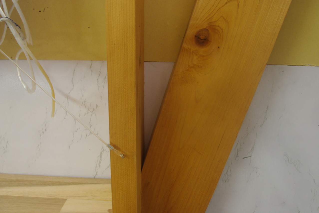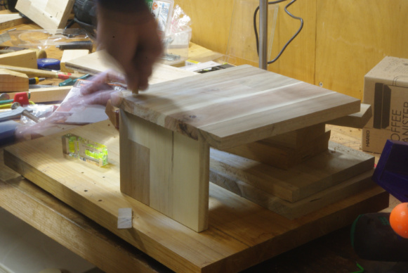 その棚板材に2箇所の隠しネジ穴を開けまして、桁足材と組み合わせネジ留めを行いました。