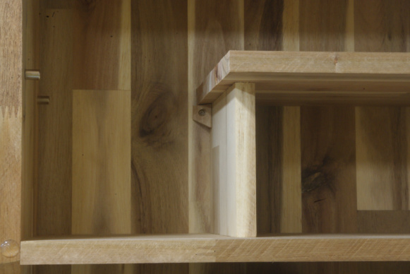 その棚板に3/4ほどの奥行きのアカシヤ集成板材を、棚板を支える桁足材として組み合わせます。