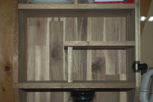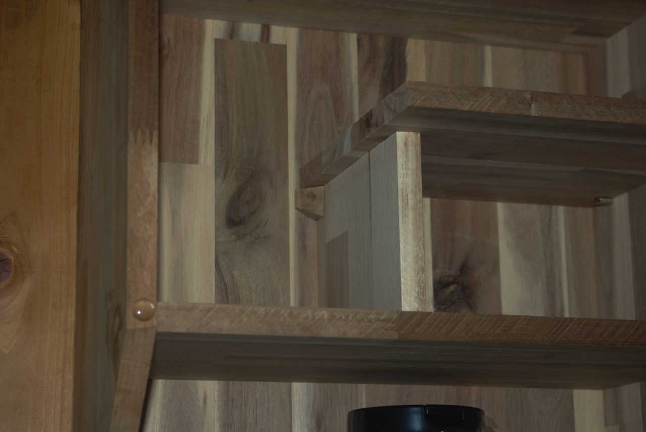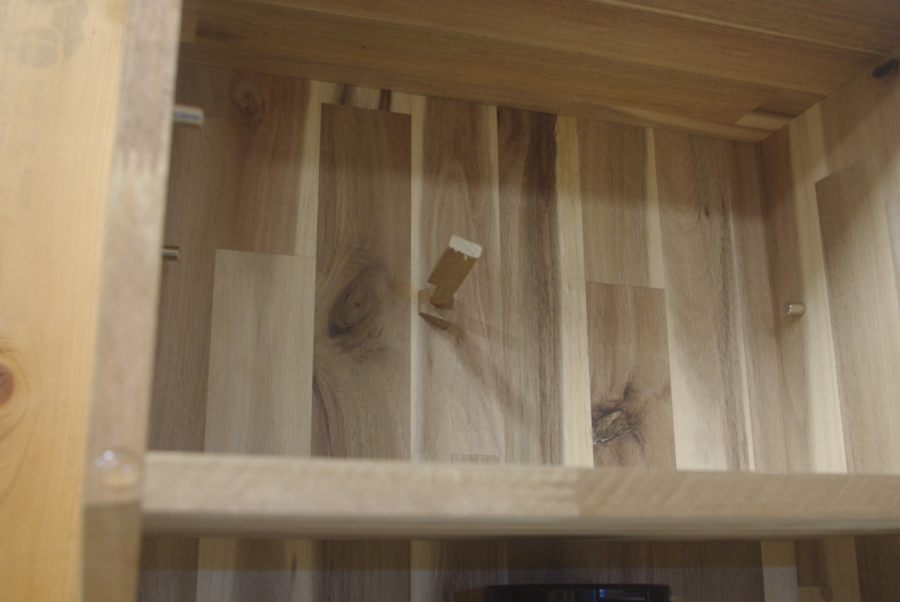 本当に小技ですが棚板材から切り出しまして、背後の背板に溶け込むようにその造形には思いっきり拘ってみました。