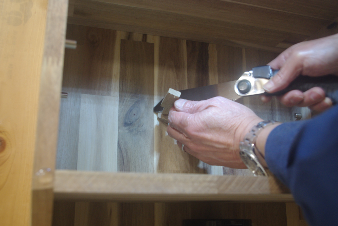 覚えておられると思いますが、左のこの画像は食器棚を製作しました翌日の3月12日に、追加棚のダボ溝を加工している映像をキャプチャーしたものですが、このとき補助材として利用しました棚板材に目を付けました。