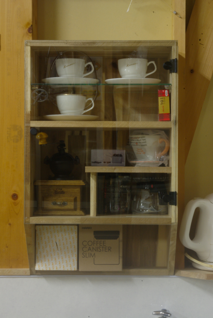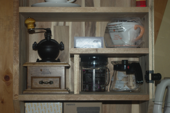 これも桁足材を3/4の奥行きにしたこととほぼ同様の理由で、さらに収納しているコーヒーミルとの位置関係も考慮しております。