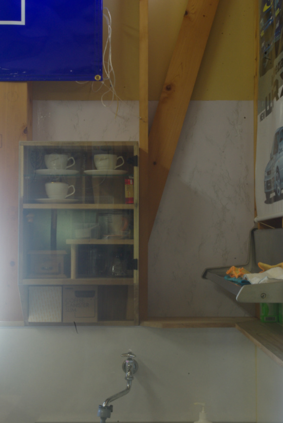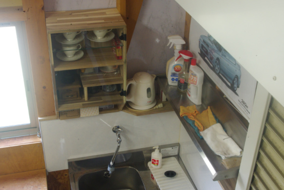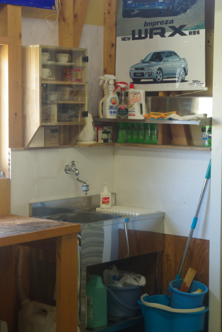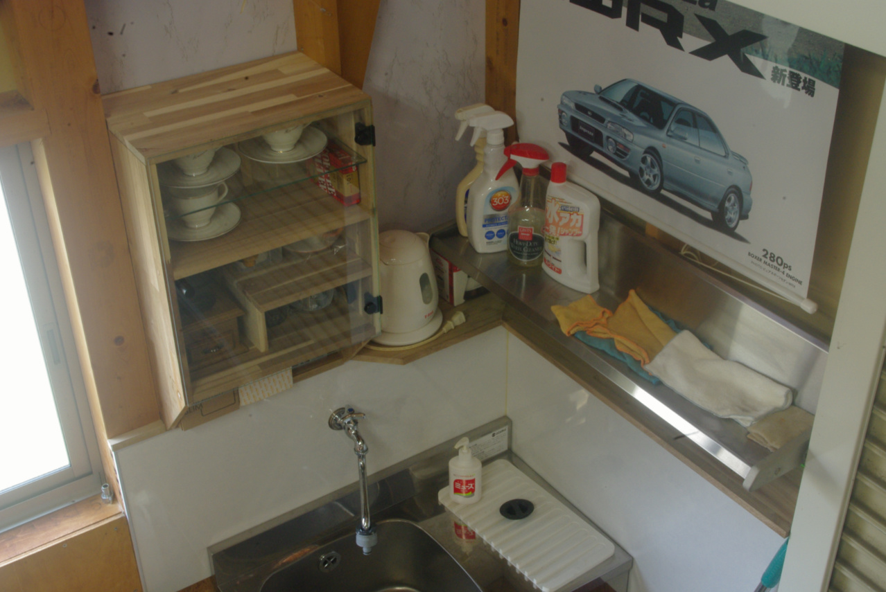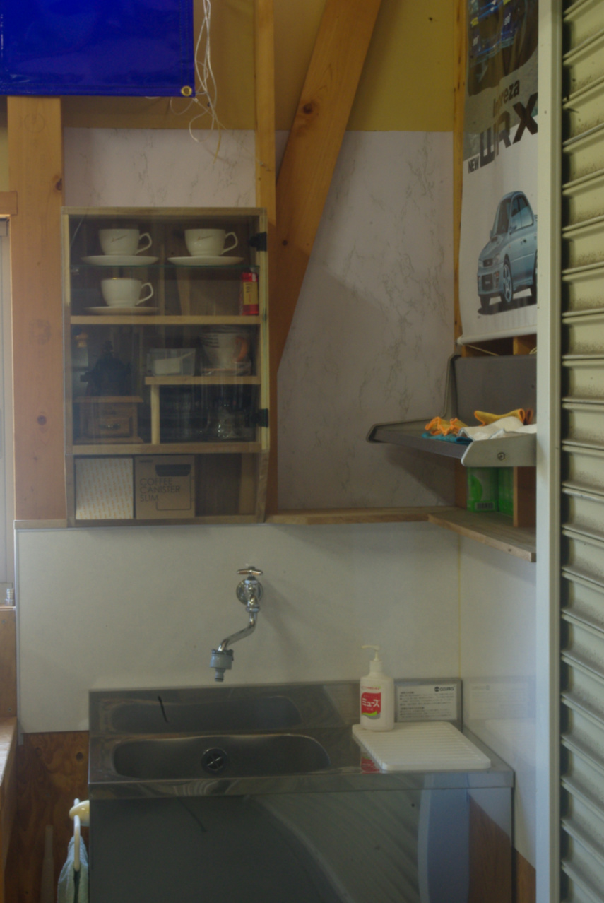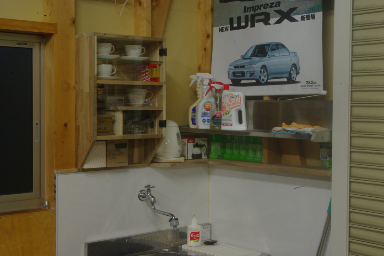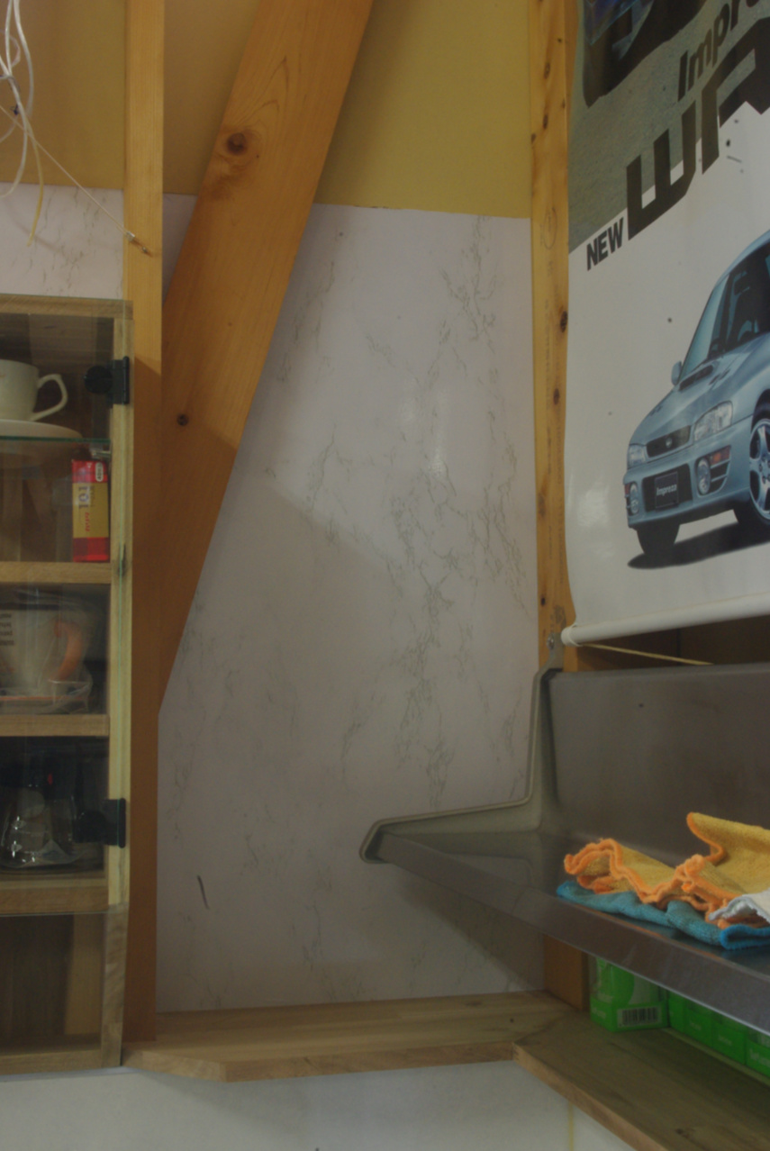アールエーアール鈴鹿のガレージの内装は、打ちっぱなしのコンクリートのように材木やコンパネ等建材の素材そのものの良さを前面に打ち出したものが基本ですが、この流し台コーナーだけは⑯業務用シンク設置と給排水設備 を導入しました当初から、実用性を重視しましてアイカセラールというメラミン不燃化粧板を一部の壁に施工してました。