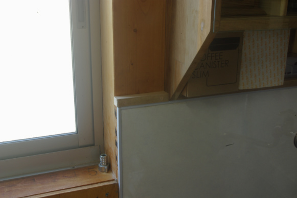 ㊹食器棚追加工と流し台コーナーの壁紙貼り