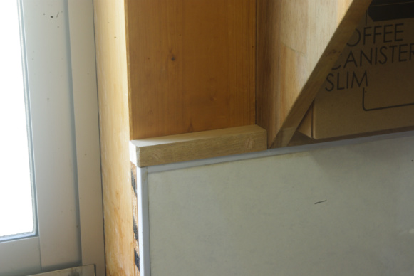 柱の下、アイカセラール化粧板の上に、まだダボ木が突き出たままの木片が見えます。