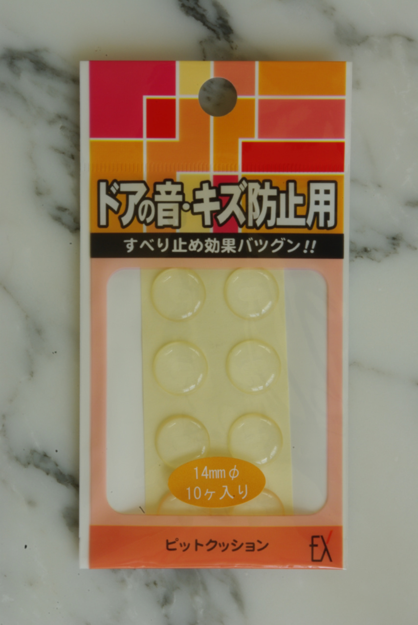 それからここまでの一連の画像をご覧になった中で、食器棚のガラス扉の左縁の上下に見えています、透明のピットクッションの存在にお気づきの方もいるかもしれません。