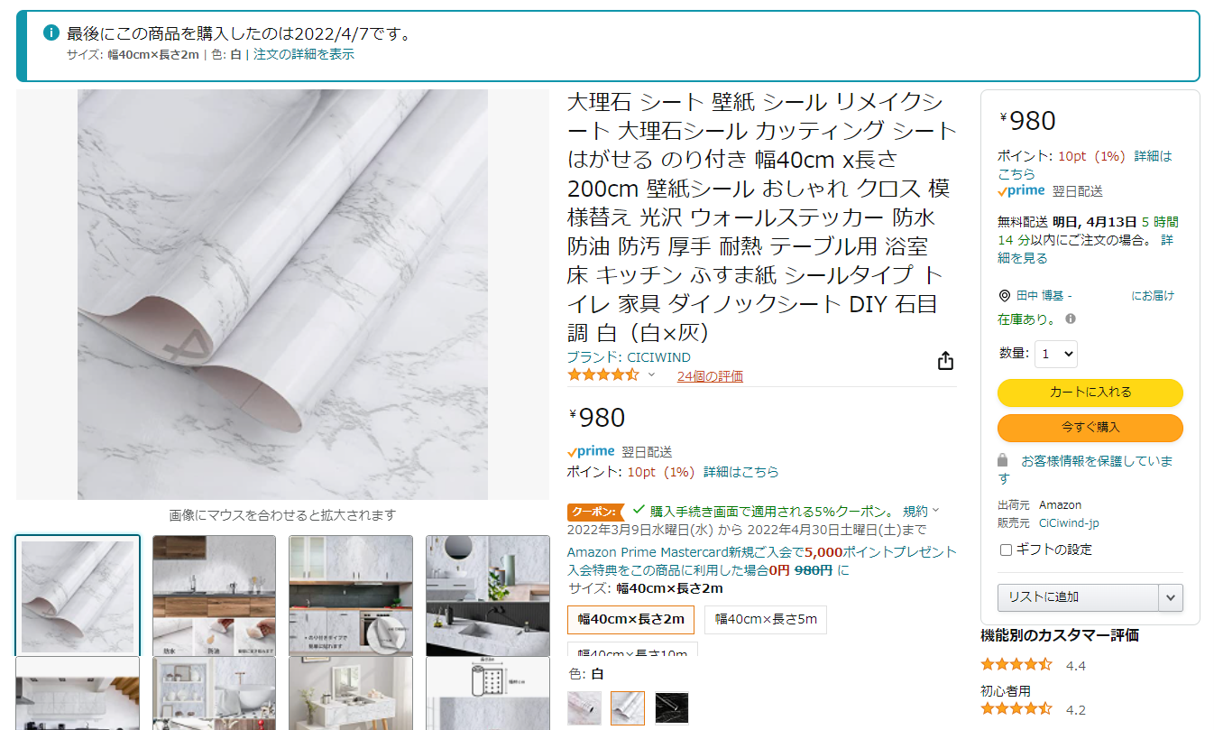 アイカセラールとまったく同じ質感や柄のものがあればもっとよかったのかもしれませんが、残念ながらそれはムリでしたので、出来るだけ質感の近かったこの大理石柄にしました。