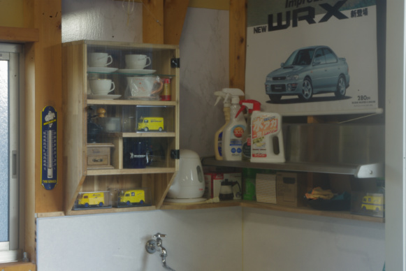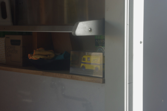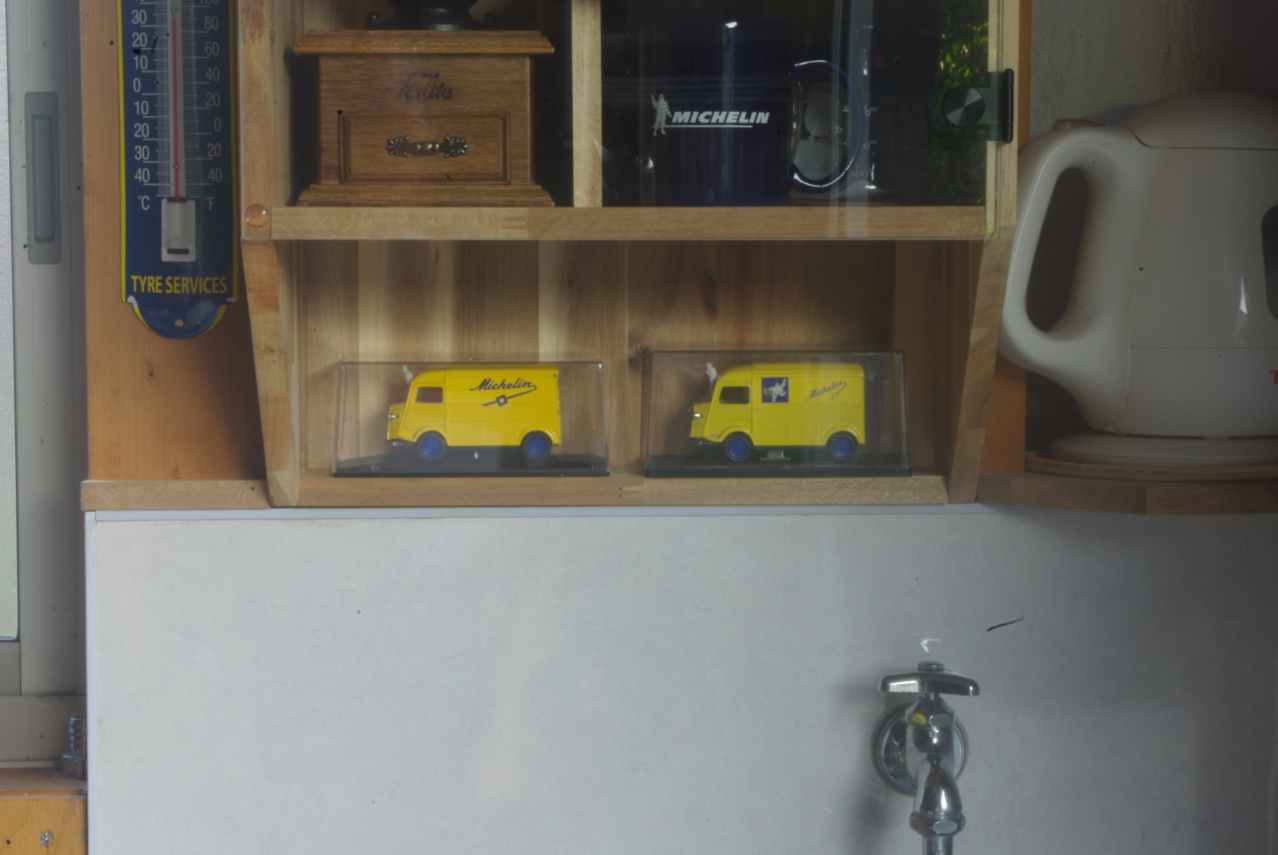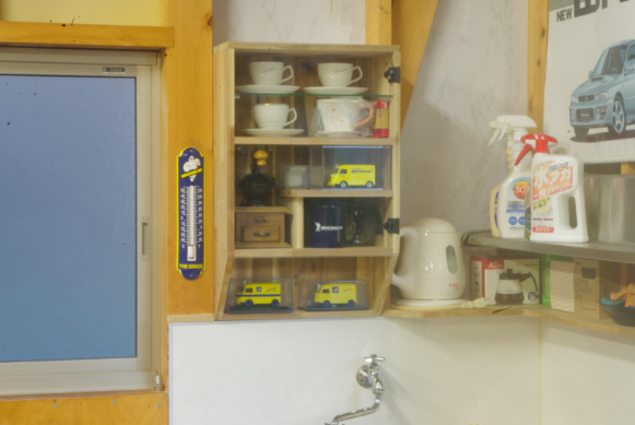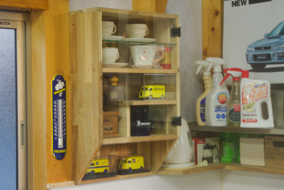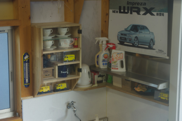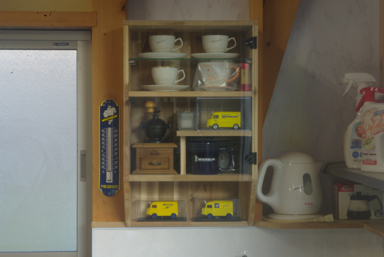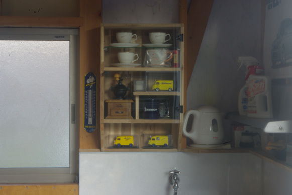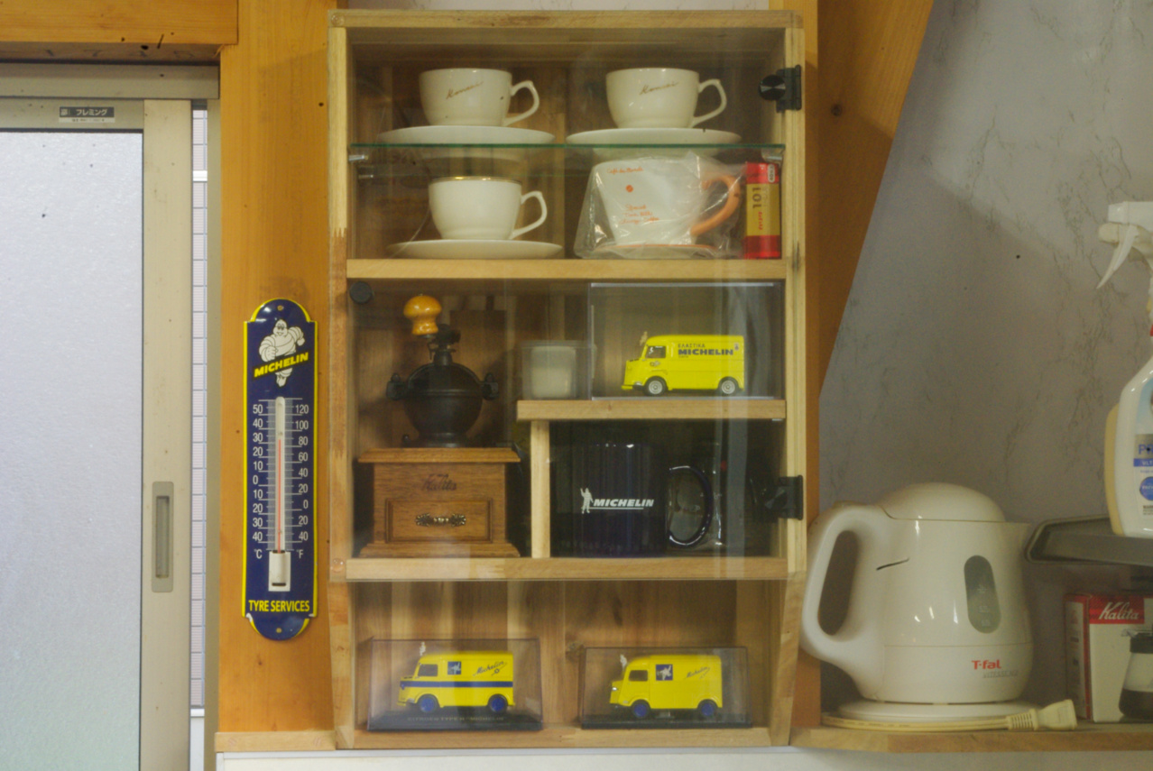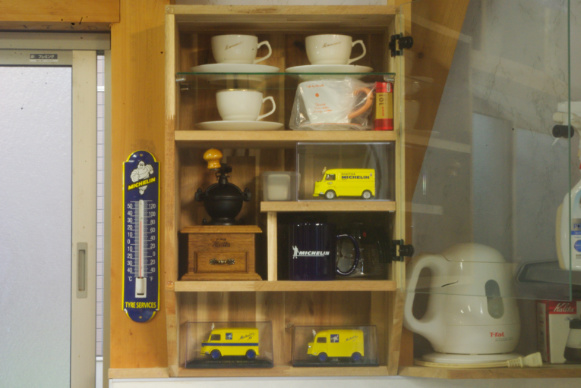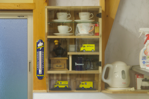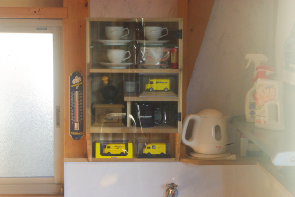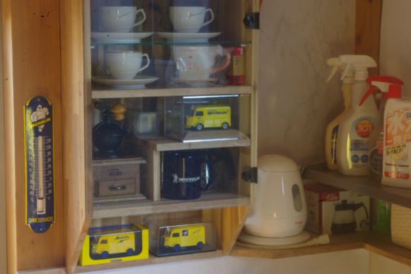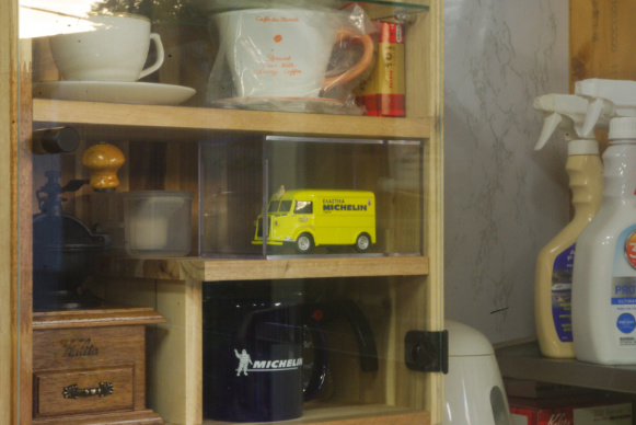 ところで前回食器棚に展示しておりましたこのALTAYA 1/43 - CITROEN TYPE H - MICHELINは、ケース台座の奥行きが若干棚からはみ出していましたので、早々にこちらの流し台右側の棚に移動しておりました。
