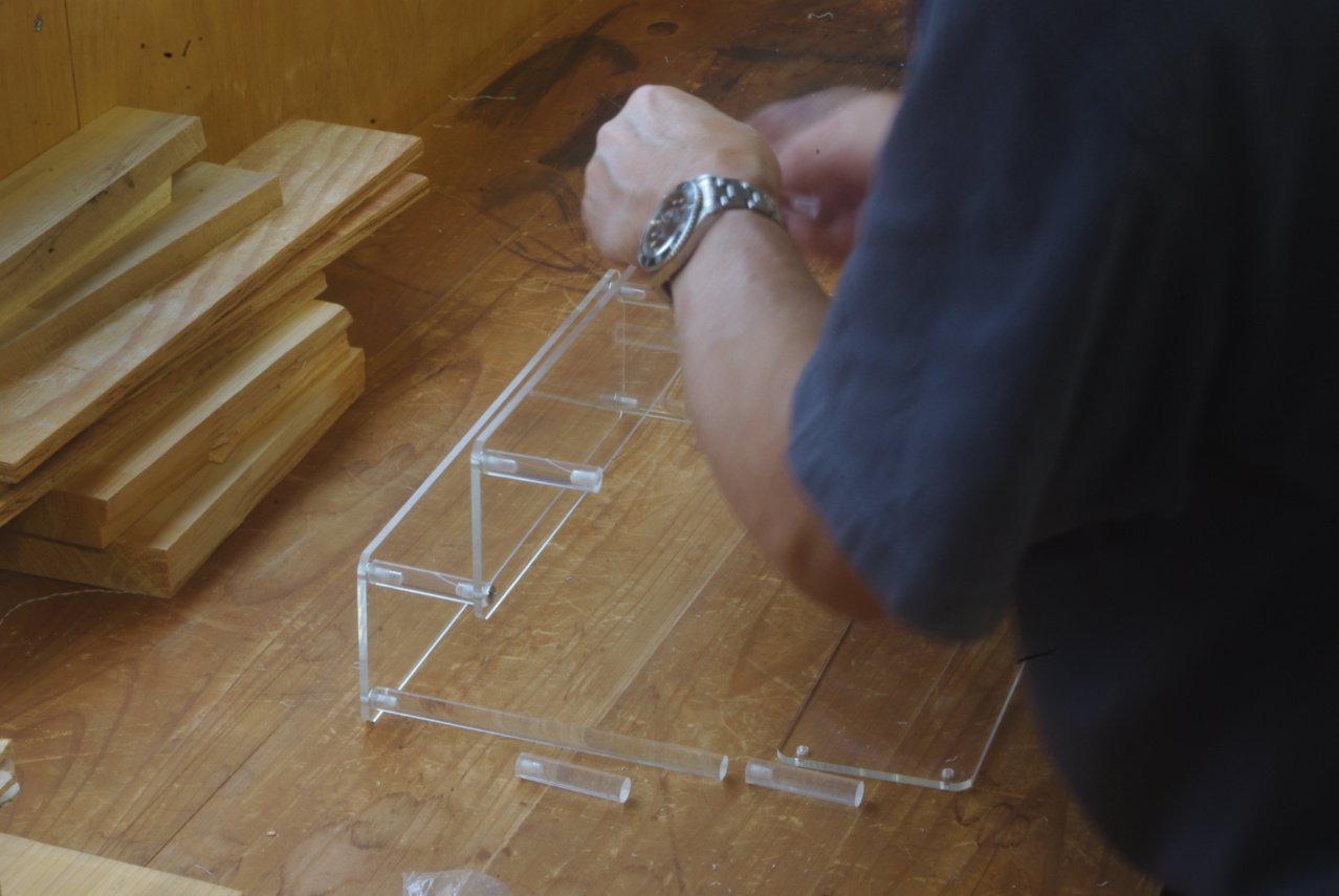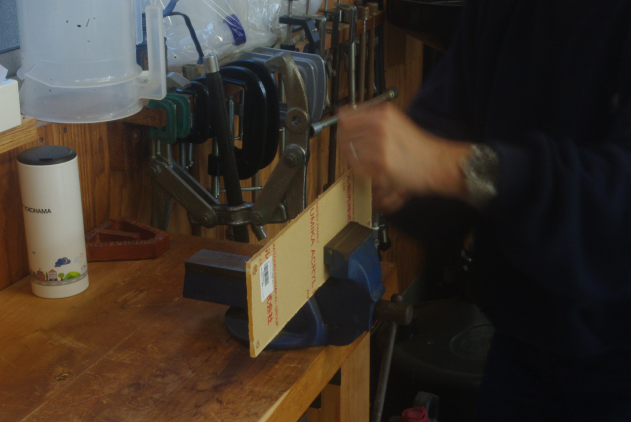 ネジ穴の加工が終了しましたので、アクリル棚の切断面の修正や四隅のラウンド加工を平ヤスリを使用しまして丁寧に実施しました。