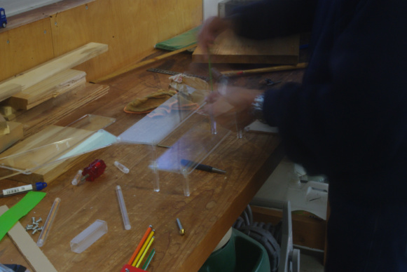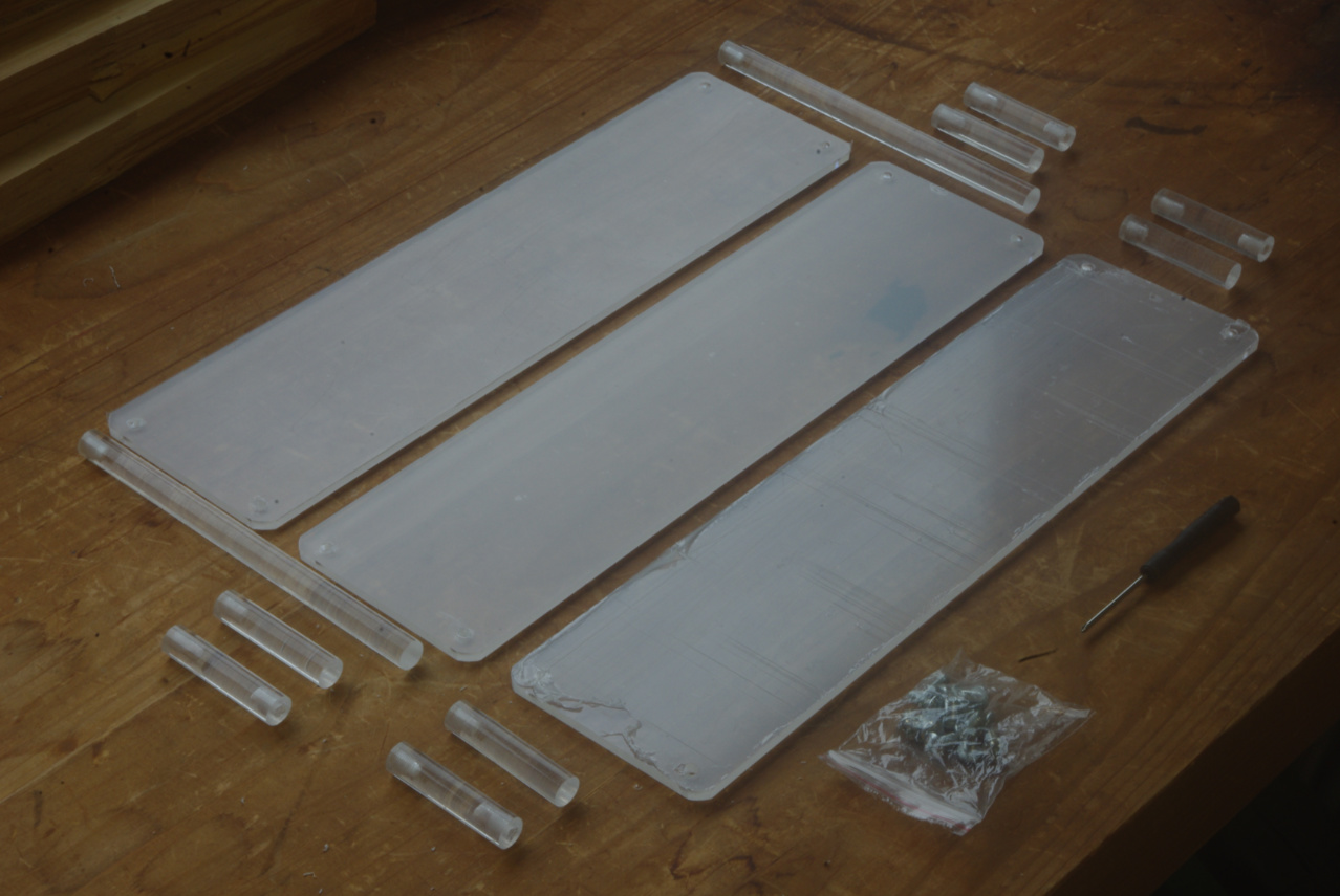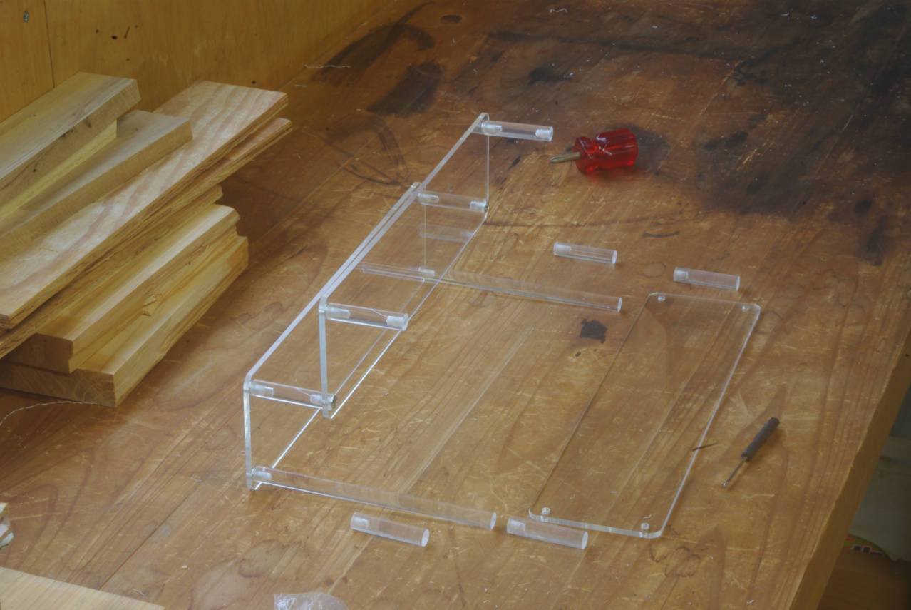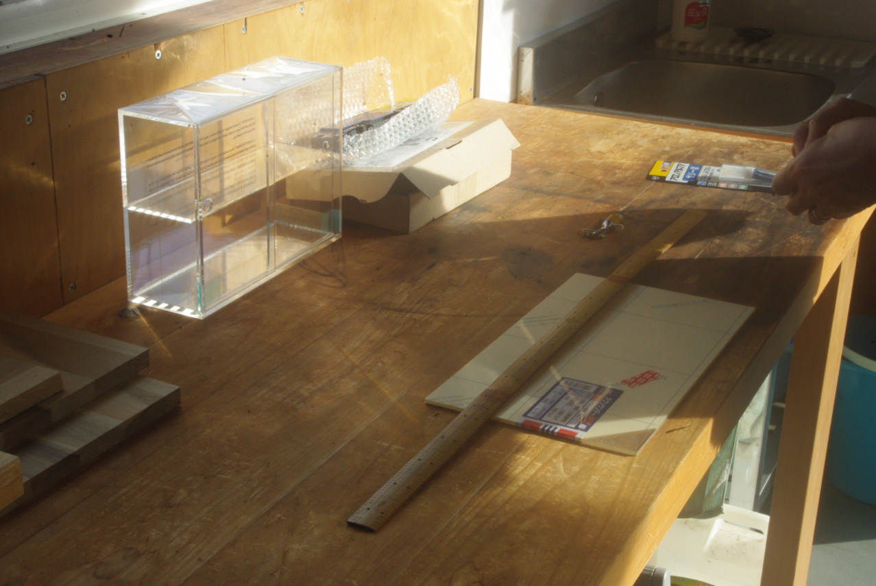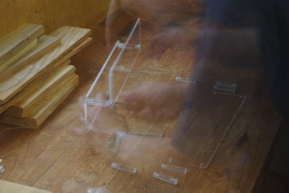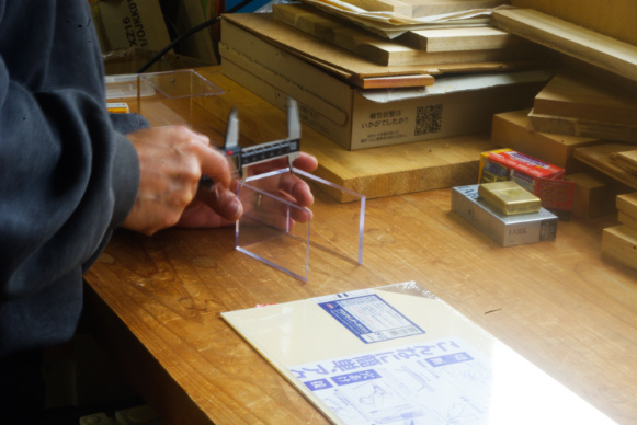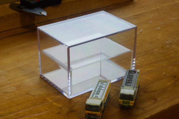 このアクリル板を加工しまして、ミノルキューブの中にピッタリ収まるサイズの棚を製作します。