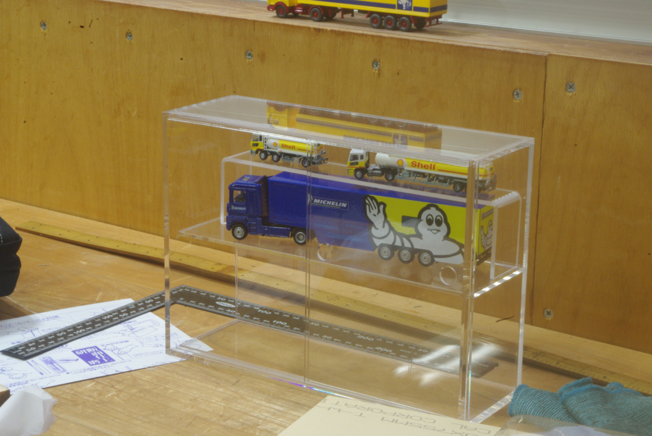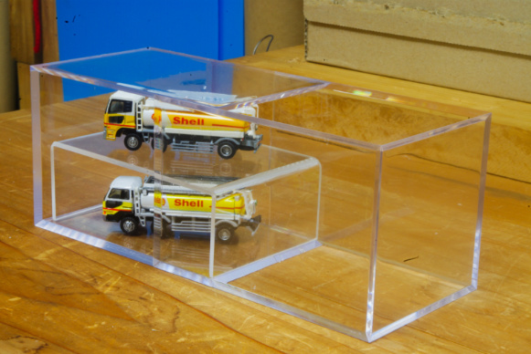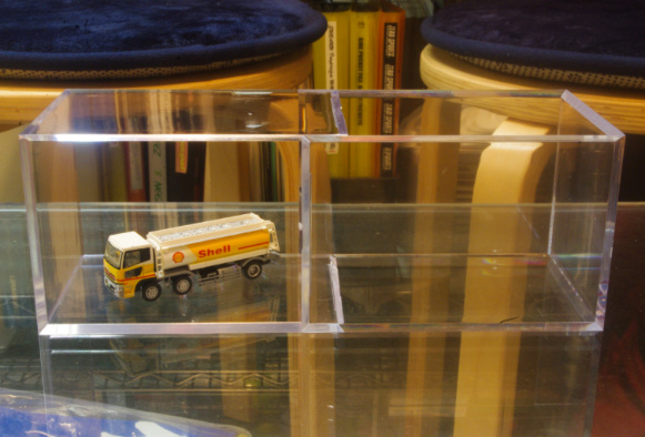 しかしこのケースだけですと、私が所有していますMiniature Carを展示する上でスペース上明らかに「帯に短し襷に長し」でしたので、3㎜厚のアクリル板を使用しまして、自作のスタンドを製作しケースに足らない部分を補うことにしました。